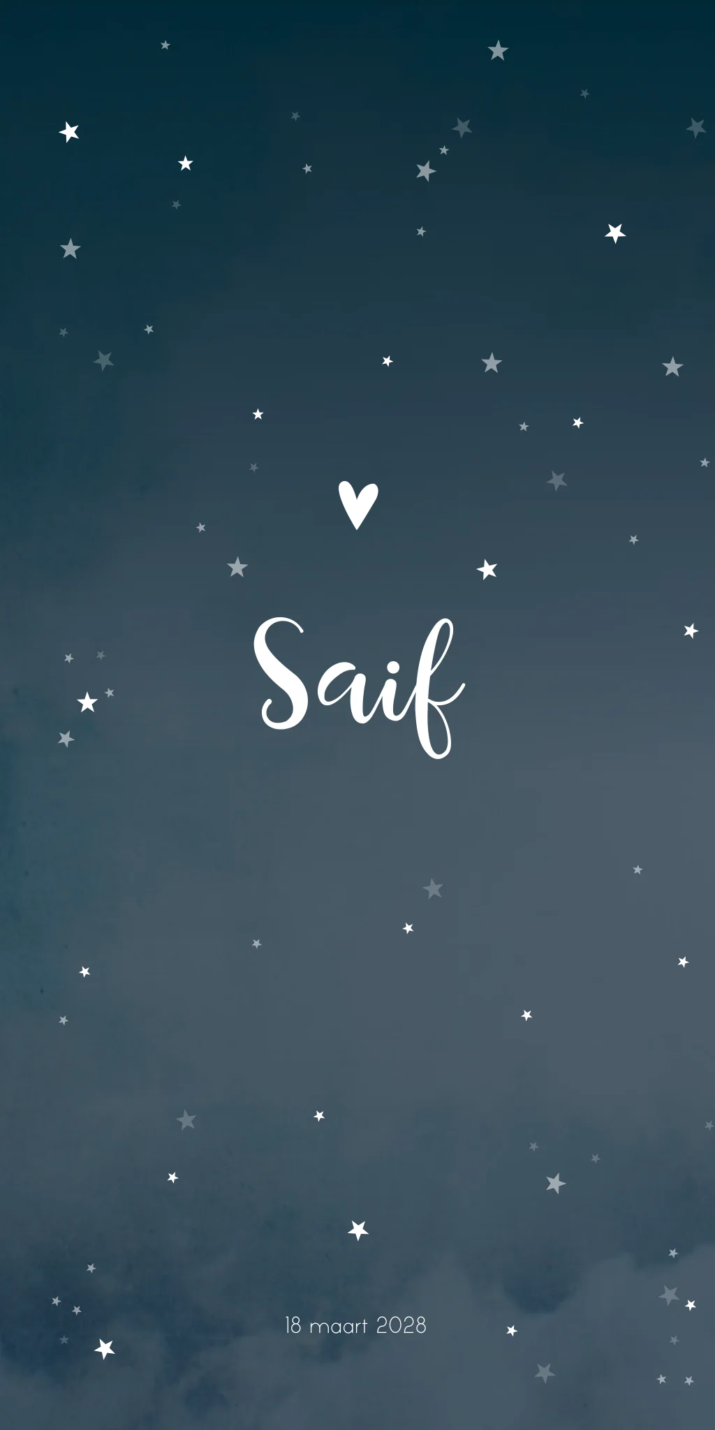 Een donkerblauw geboortekaartje vol met kleine sterren. Een speciaal kaartje voor een speciaal wondertje. Kaartje Saif is prachtig wanneer je deze laat bedrukken met koperfolie. Zo glinsteren de sterren je tegemoet!