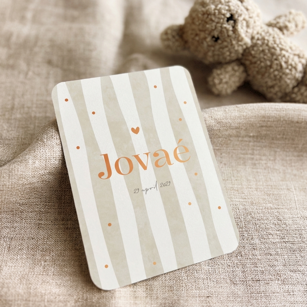 Een stoer en trendy geboortekaartje met streepjes in beige en witte kleur met koperfolie als details voor de naam, Jovaé.