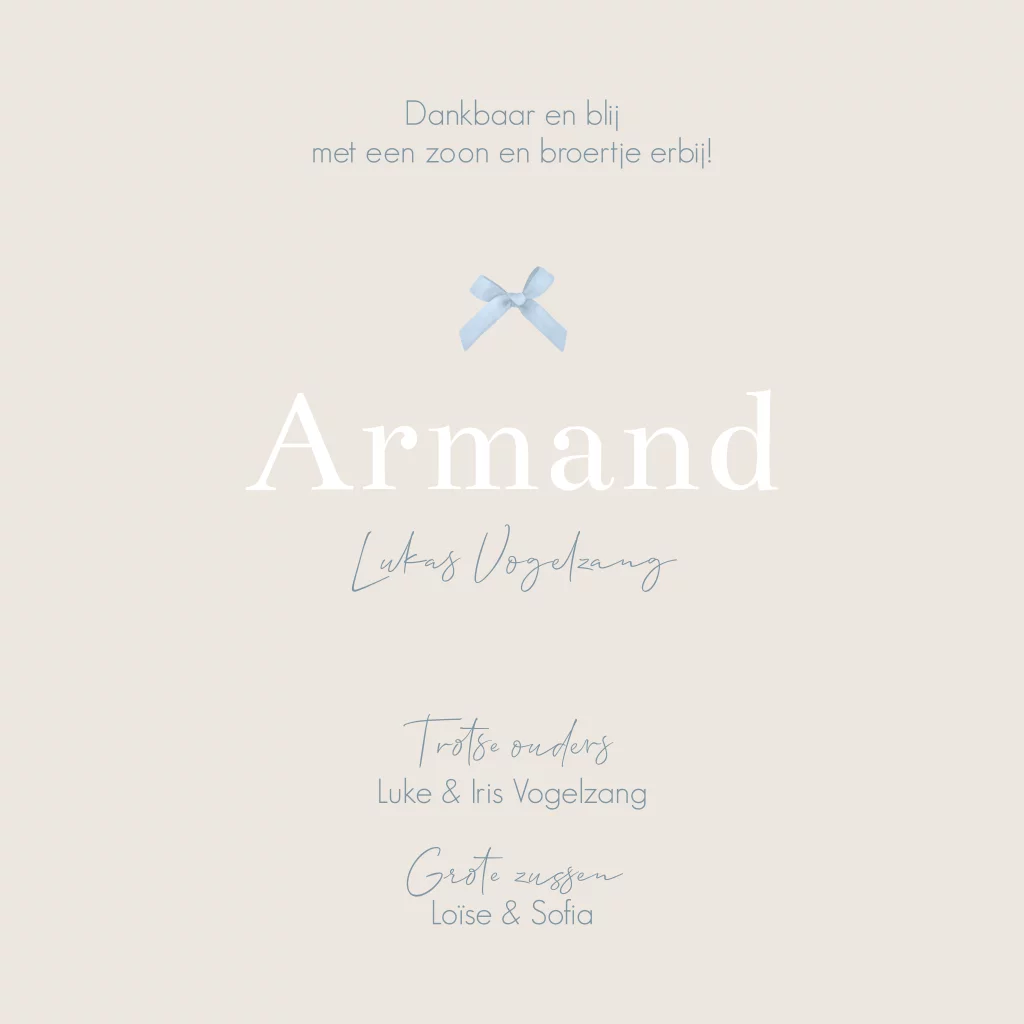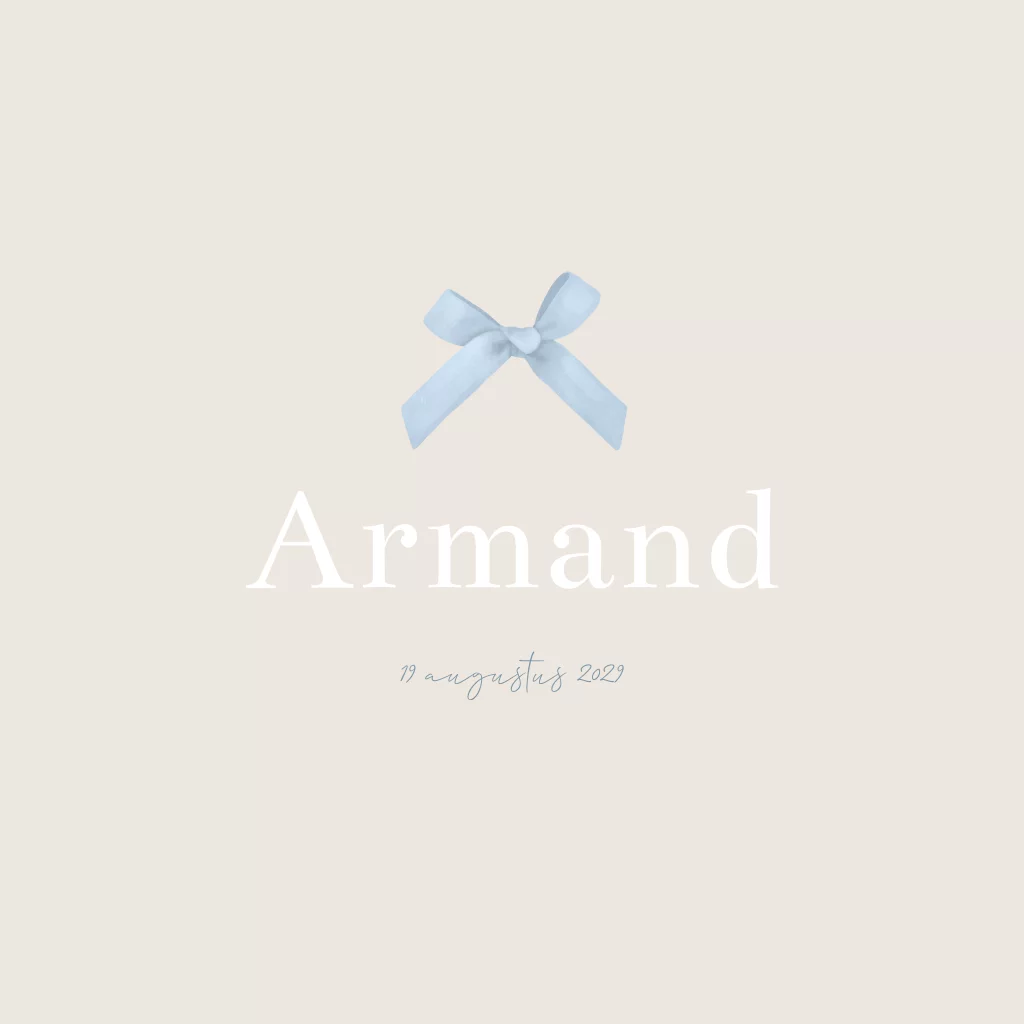 Een klassiek en tijdloos geboortekaartje Armand in neutrale en blauwe kleuren. Het strikje maakt het wat chique. Je kunt alles gemakkelijk naar je wensen aanpassen, ook de kleur van het strikje.
