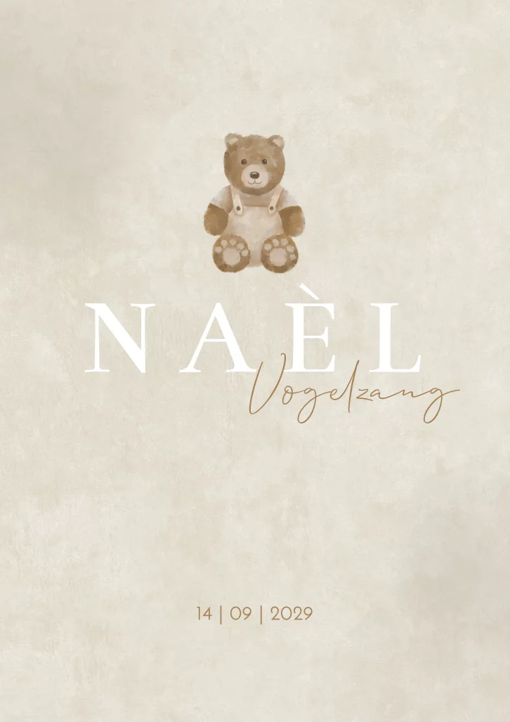 Een stijlvol en trendy hip geboortekaartje Naèl met een suède/ velvet look achtergrond in beige/ créme kleur. Het teddy Beertje in watercolor maakt het kaartje speels en lief. De bruine letters kun je aanpassen naar hoe je het mooi vindt, zo ook het lettertype. Vraag gerust onze hulp als je het kaartje anders zou willen en je komt er zelf niet uit.