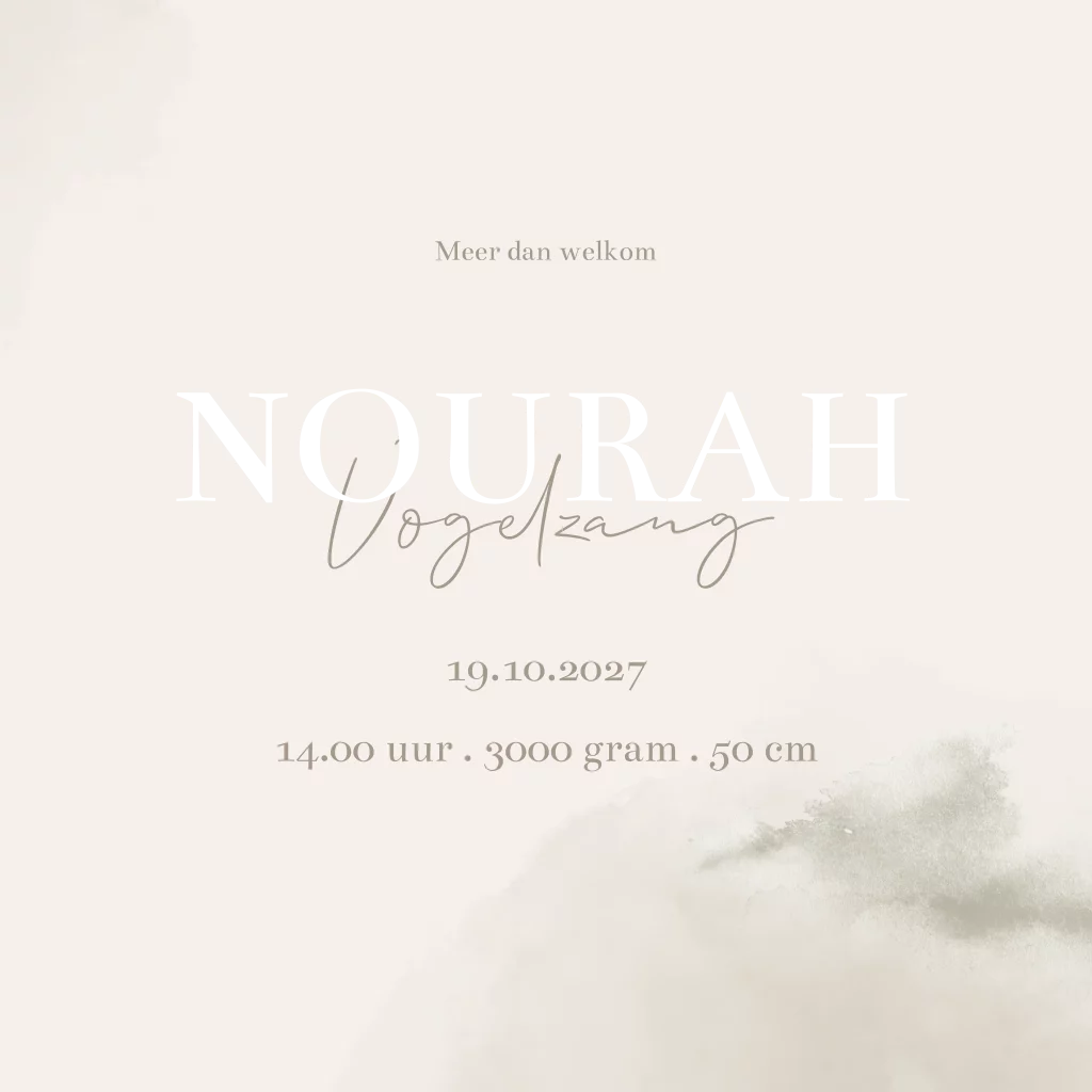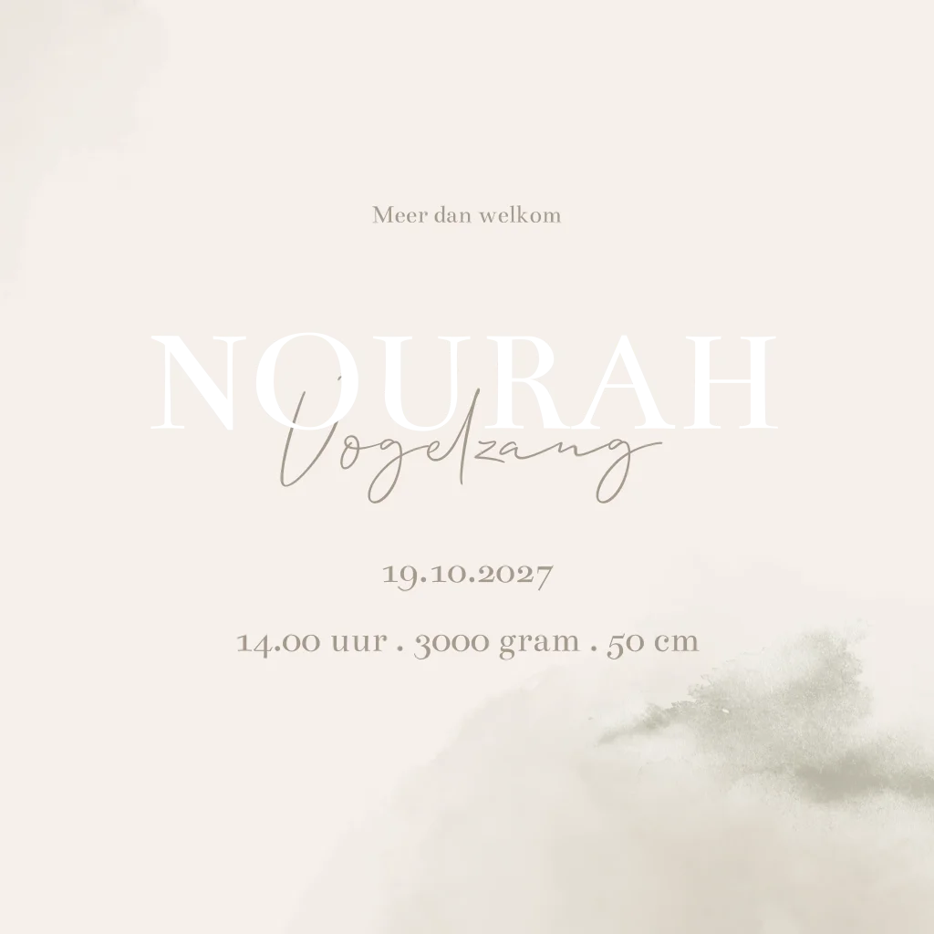 Stijlvol en tijdloos ontwerp voor een babykaartje in beige en crème natuurlijke tinten. De waterverf vormen maken het kaartje speels en hip. De naam Nourah is in goudfolie gezet. Dit kun je gemakkelijk zelf aanpassen in de online editor.