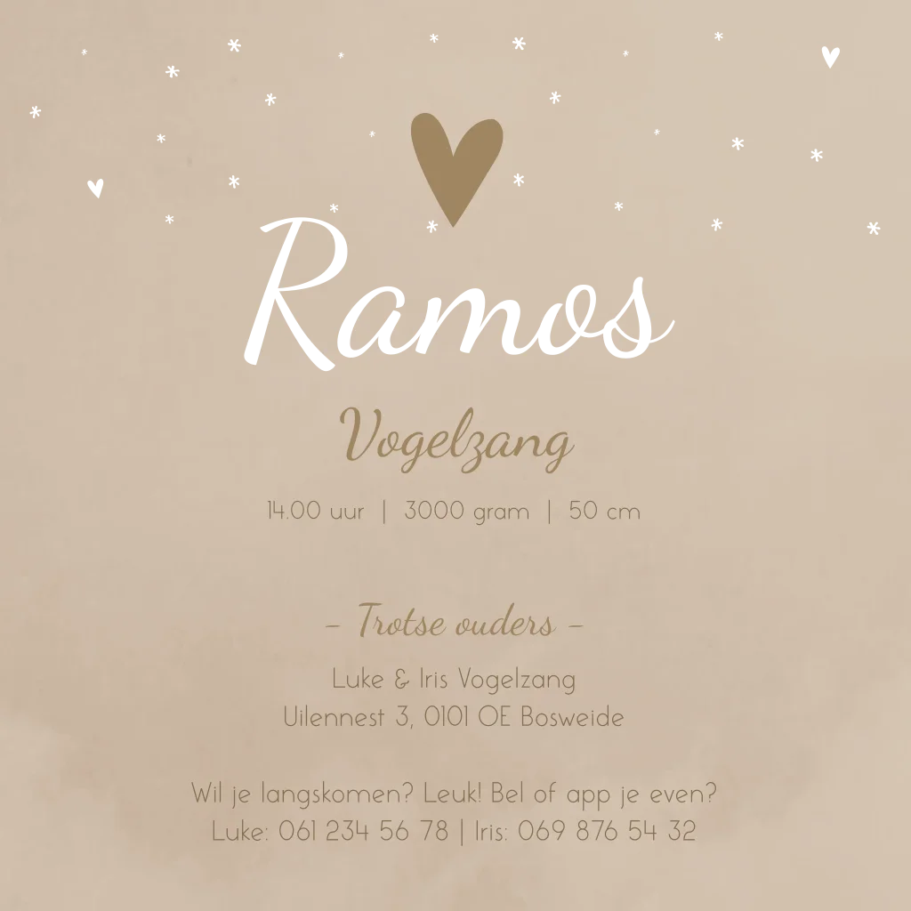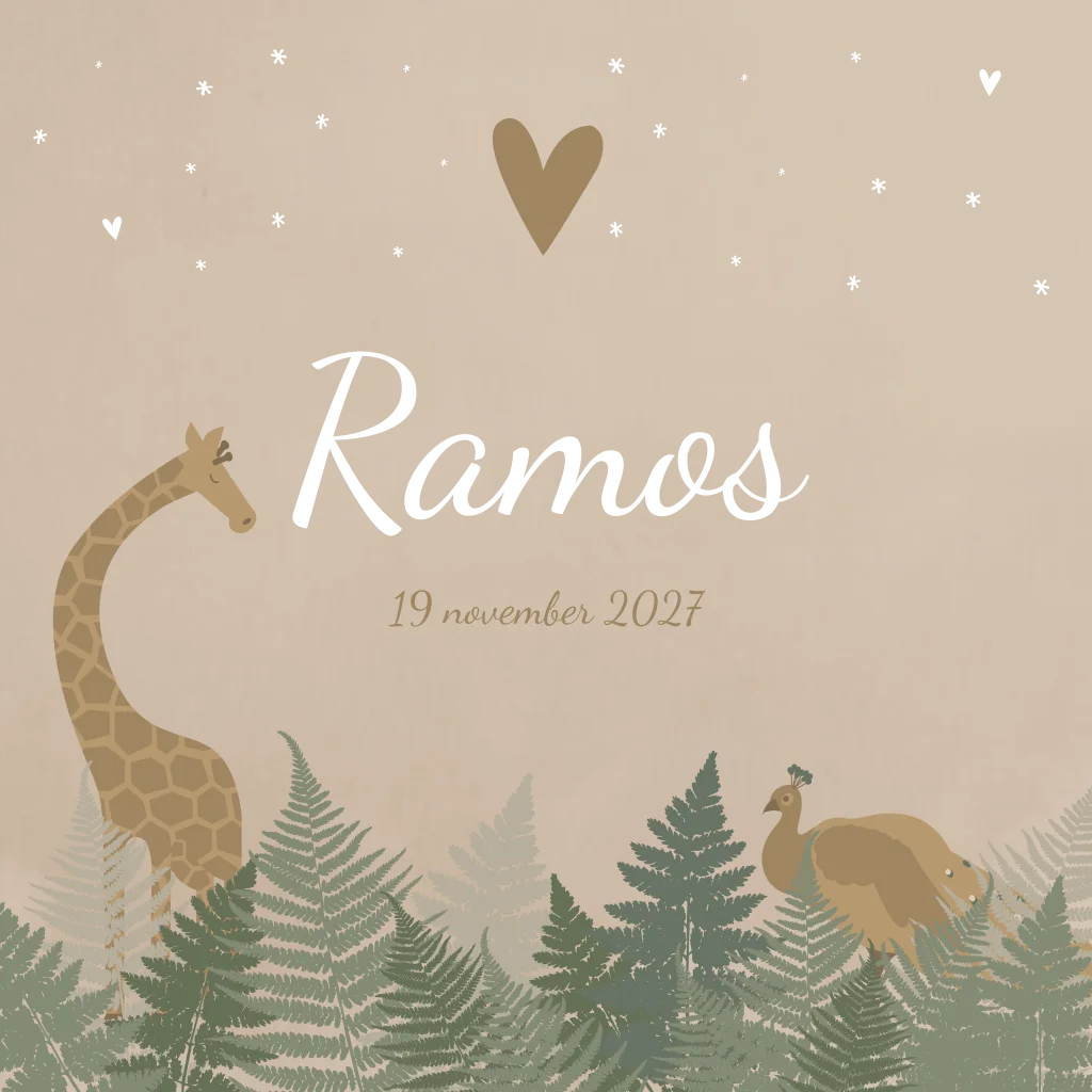 Een taupe kleur kaartje met goudfolie hartjes/sterretjes. Op kaartje Ramos staan een giraffe en een pauw omringd door de jungle. Een geboortekaartje voor de echte dierenliefhebbers en avonturiers!