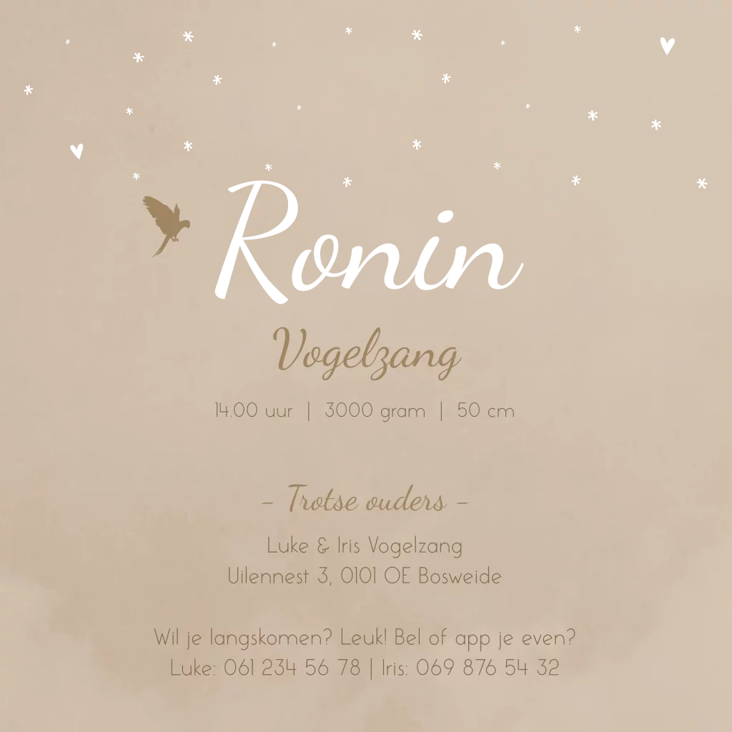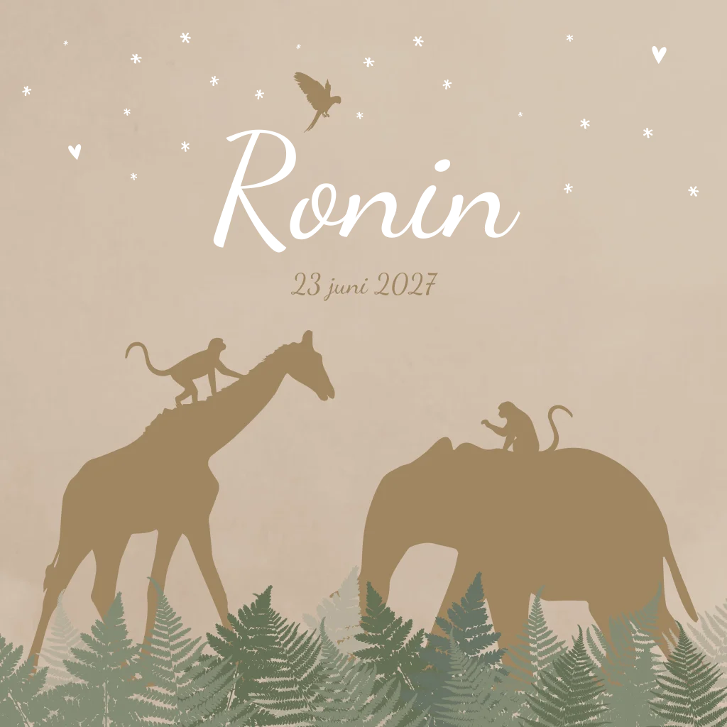 Een taupe kleur kaartje met goudfolie hartjes/sterretjes. Op kaartje Ronin staan een giraffe en een olifant met aapjes omringd door de jungle. Een geboortekaartje voor de echte dierenliefhebbers en avonturiers!