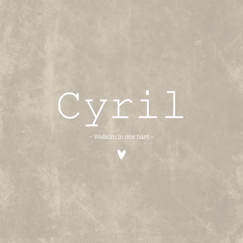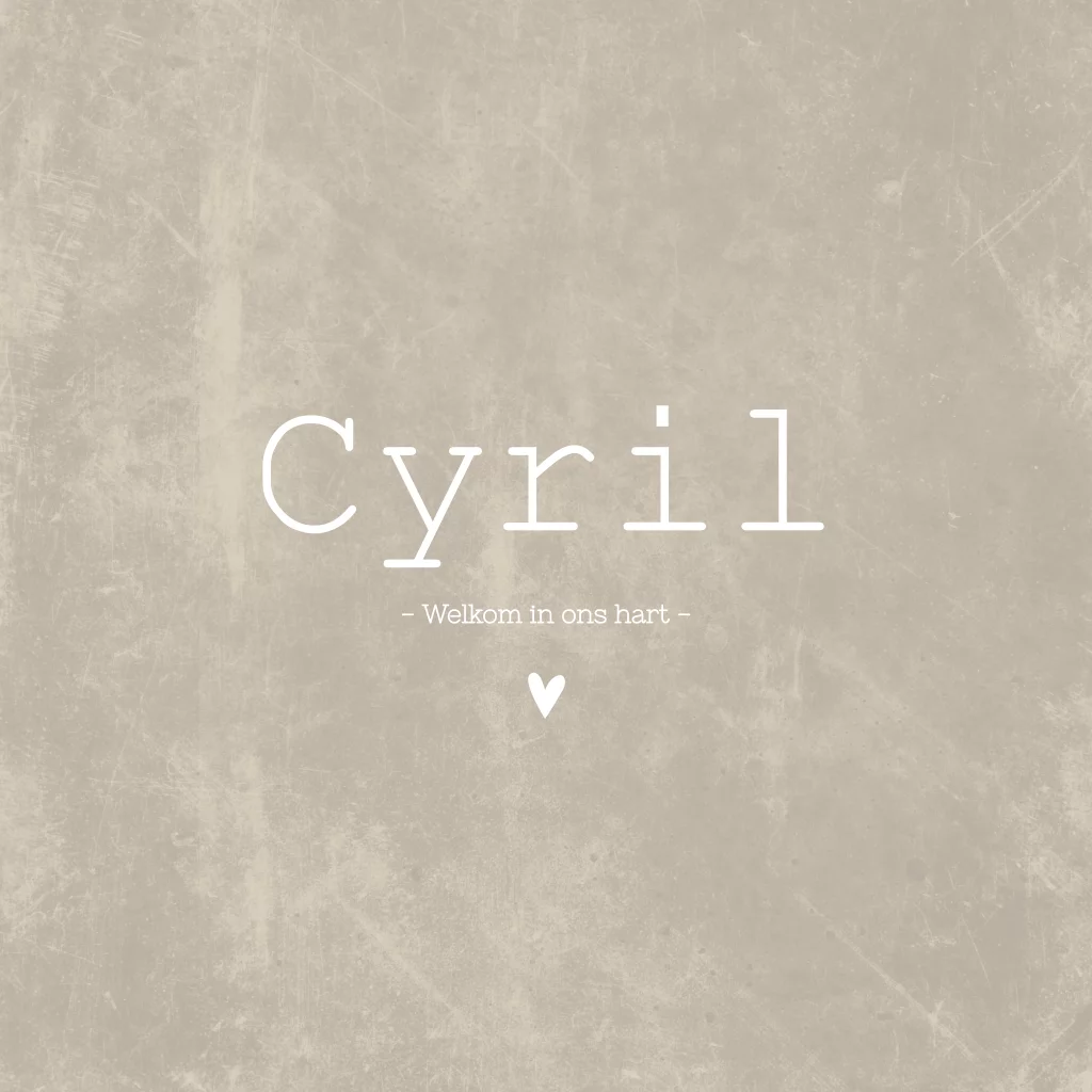 Simpel en chique geboortekaartje Cyril met witte letters en een wit hartje. Kies je eigen lettertype en kleur in de editor en maak het kaartje helemaal naar jouw smaak!