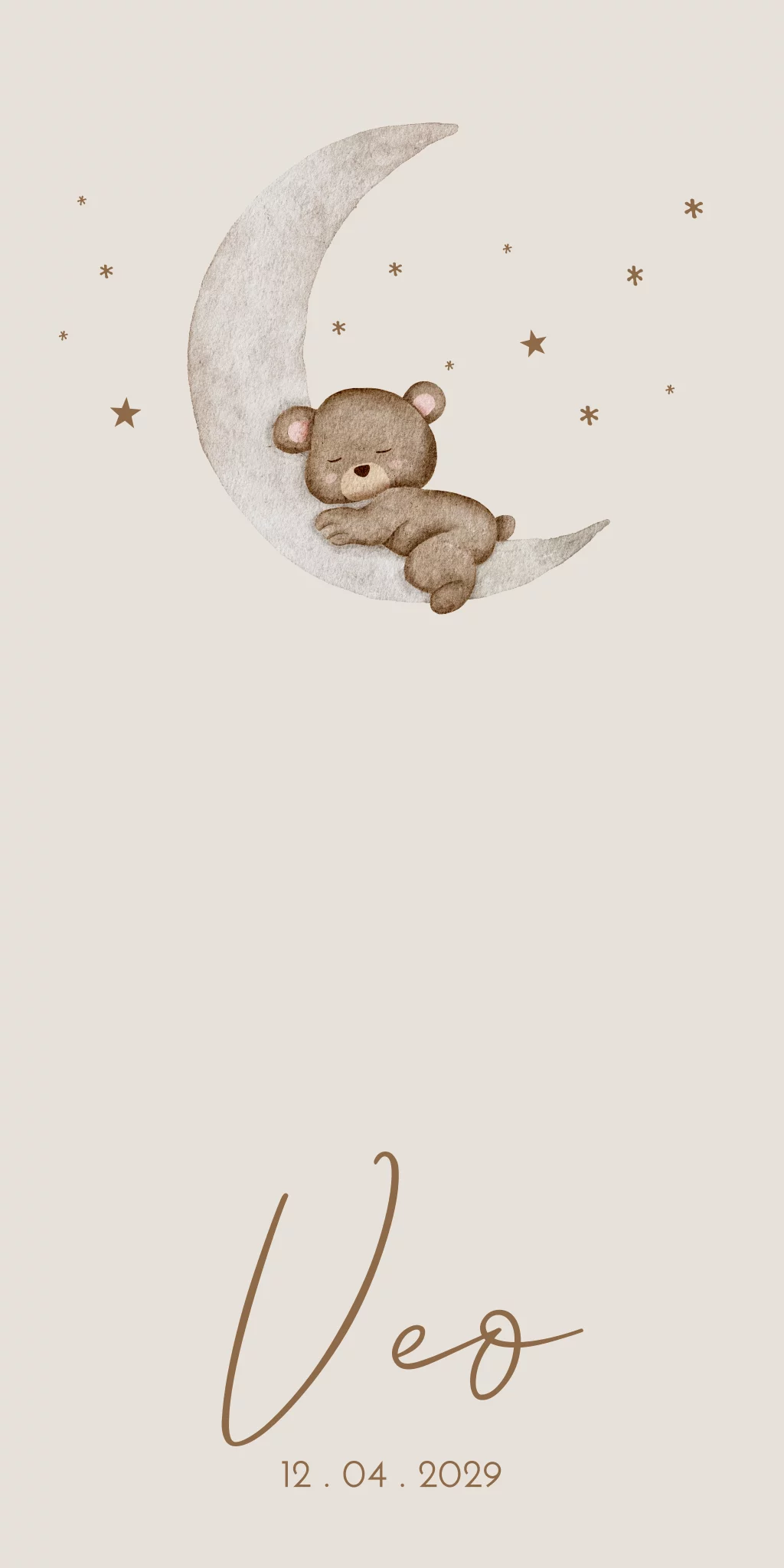 Hip en stijlvol geboortekaartje met een teddybeer in waterverf stijl die ligt de slapen op een maantje. De kaart Veo is in een naturel beige tint, dit is allemaal aanpasbaar in onze online editor. Let op: het lint moet je er los bij bestellen. Je vindt het lint onder het kopje 'bij de kaart'.