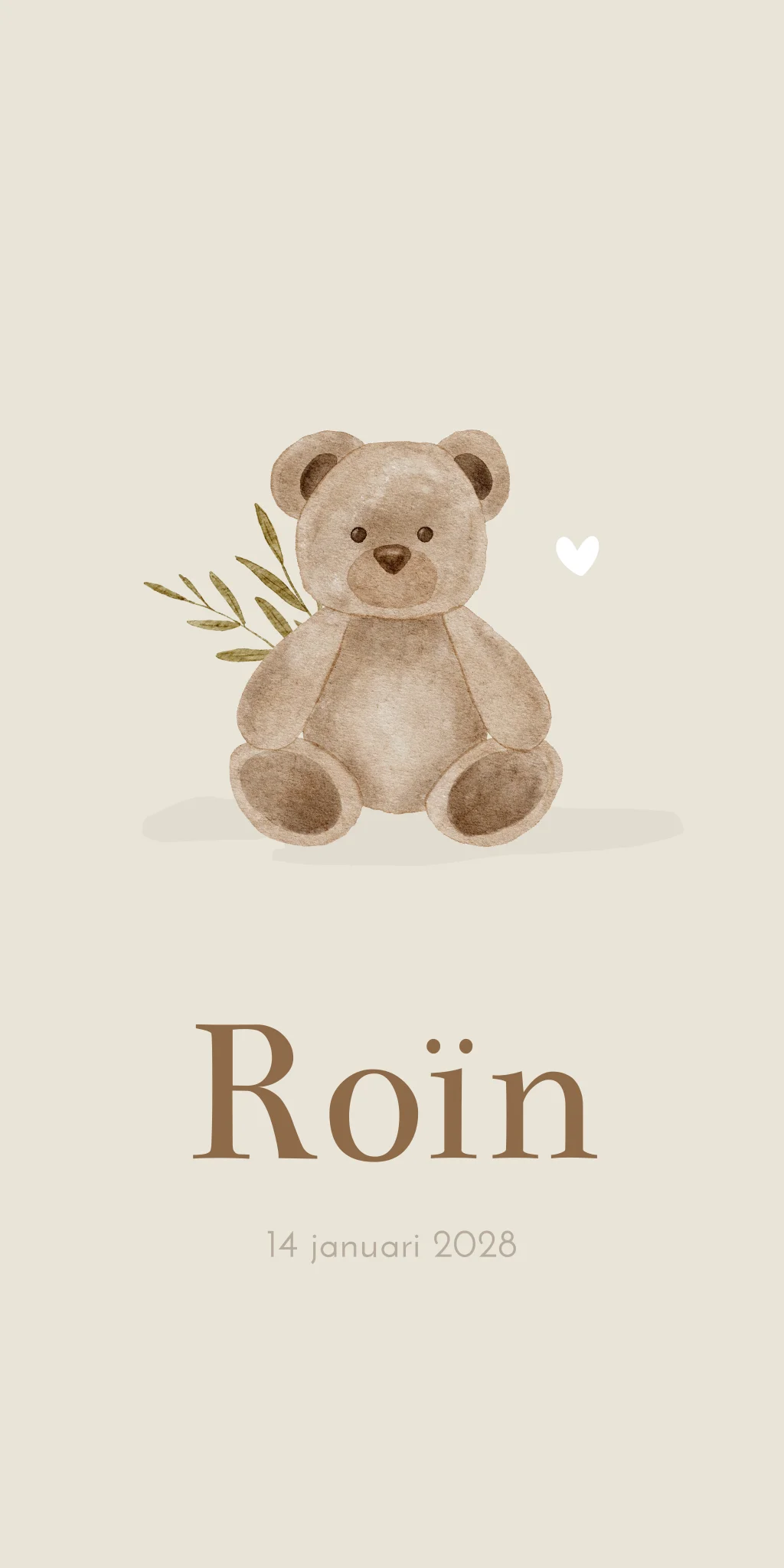 Hip en stijlvol geboortekaartje met een teddybeer in waterverf stijl. De kaart Roïn is in neutrale beige/bruin tinten, dit is allemaal aanpasbaar in onze online editor. De beer heeft een groen takje achter zich en een wit hartje.