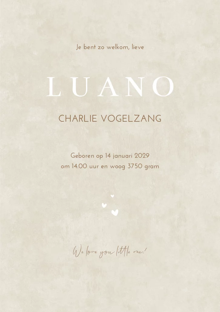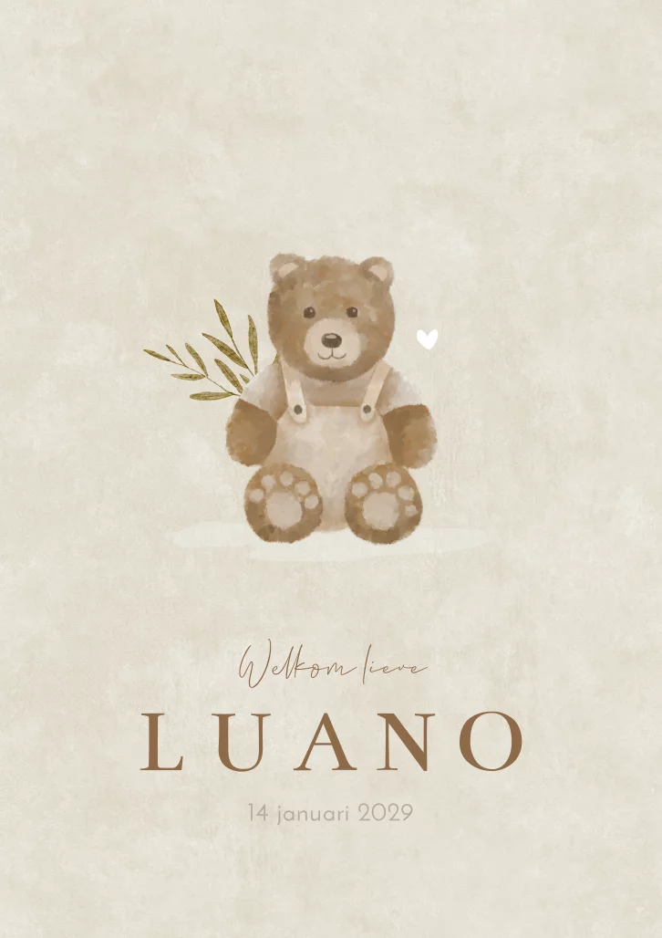 Trendy en hip geboortekaartje met een beige achtergrond met een lief waterverf teddybeertje op de voorzijde. Je past geboortekaartje Luano volledig zelf aan in de editor.