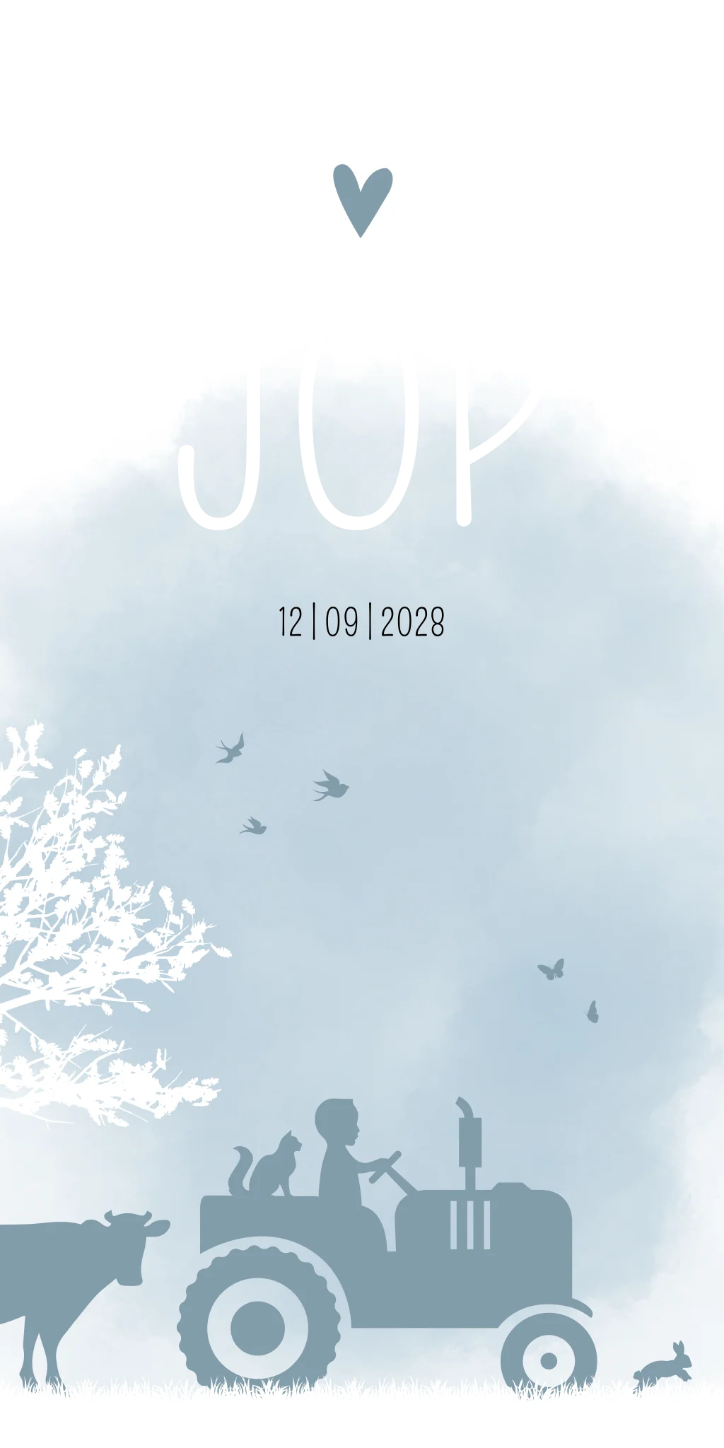 Blauw wit geboortekaartje voor een boerenjongen. Het ventje zit op een open tractor samen met zijn kat. Er staat een koe achter de trekker en voor de trekker uit snelt een haas weg. De boom maakt het tot een landelijks boers tafereel. Je kunt de illustraties helemaal zelf aanpassen naar jouw gezinssituatie. Zo kun je ook dieren toevoegen die bij jullie thuis en/of op de boerderij leven. Maak het kaartje extra speciaal met koperfolie. Je kunt alle kleuren ook aanpassen zoals je wilt. Heb je liever hulp van één van onze ontwerpers? Stuur ons dan een mailtje of een appje.