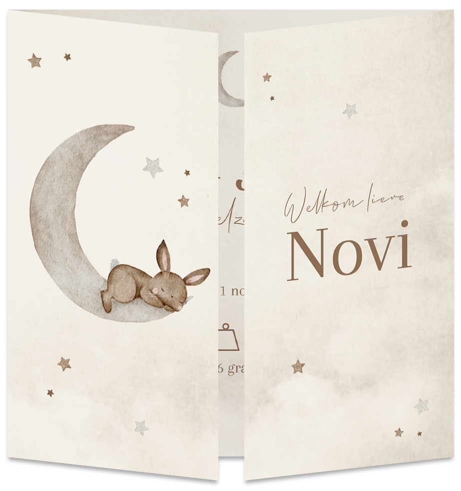 Dit unisex beige gewolkte kaartje is uniek in zijn vorm, het is namelijk een luikvouw kaartje. Op het ene flapje staat de naam van de baby en op het andere flapje is een konijntje op een maan te zien. Deze afbeelding kun je gemakkelijk vervagen voor iets anders uit onze beeldbank.