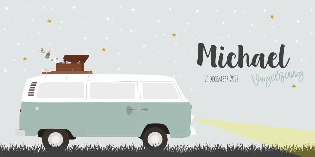 Een winters stoer geboortekaartje met een Volkswagenbusje op de voorzijde van de kaart. Wil je kaartje Michael graag aanpassen? Neem dan een kijkje in onze editor voor alle opties!