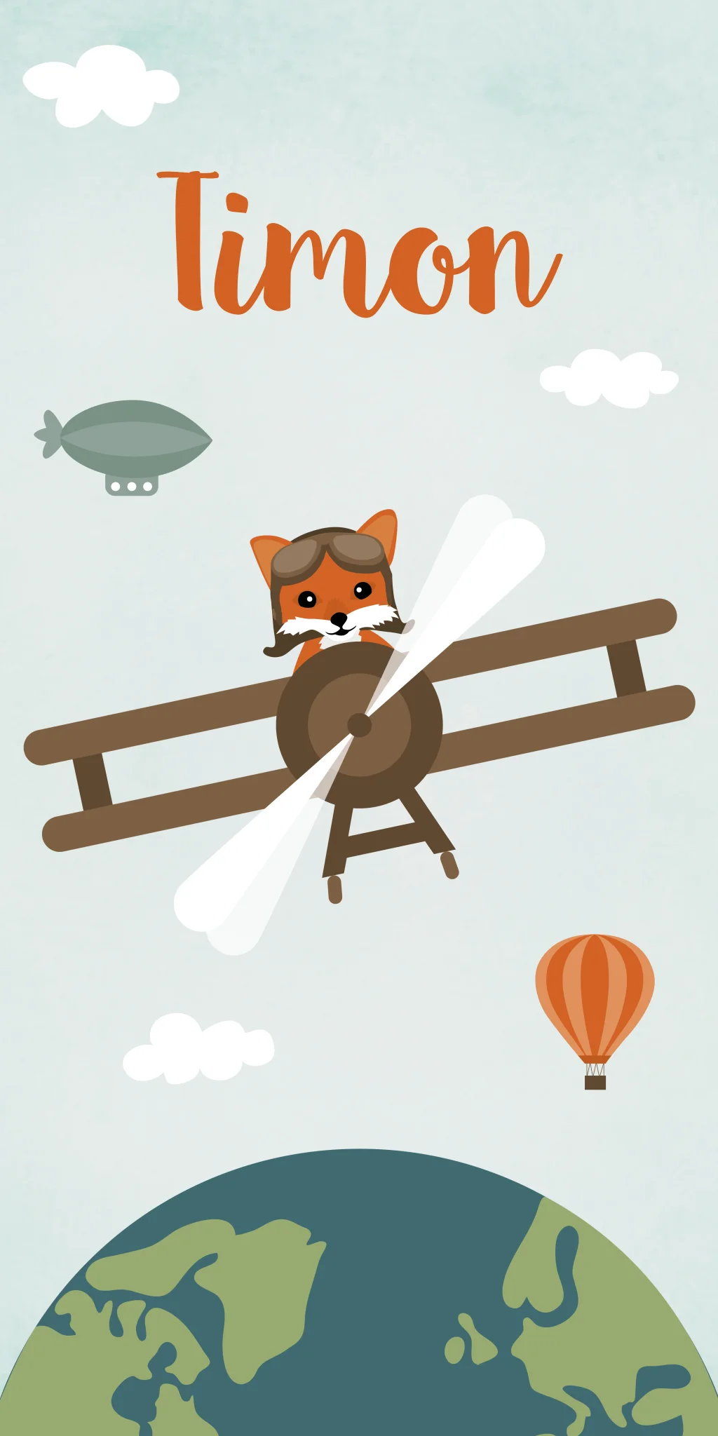 Een avontuurlijk en vrolijk kaartje met een illustratie van een vosje in een vliegtuig. Op kaartje Timon zie je een schattige vos die de wereld overvliegt. Daarnaast zie je een zeppelin, helikopter en luchtballon. Op de achterzijde is de kaart op een speelse wijze ingedeeld. Wil je graag iets aanpassen? Ga dan zelf aan de slag in onze editor!