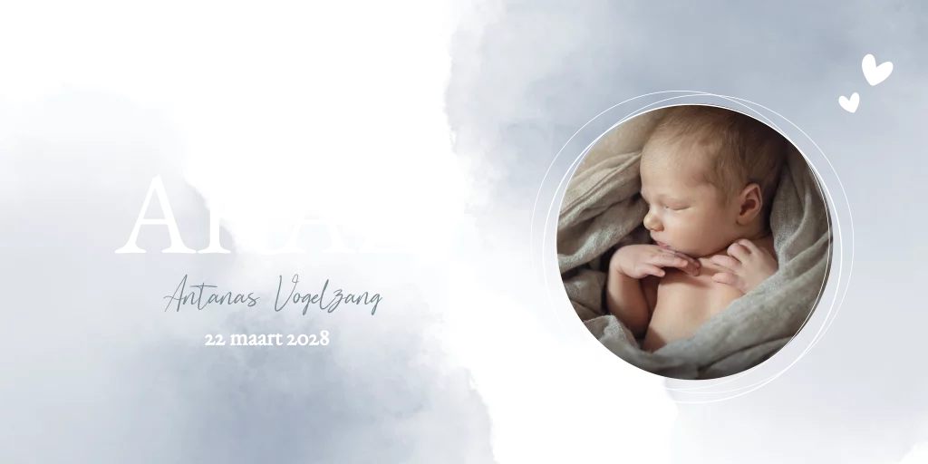 Romantisch gewolkt geboortekaartje Araz met waterverf vlekken in oudblauwe kleur.