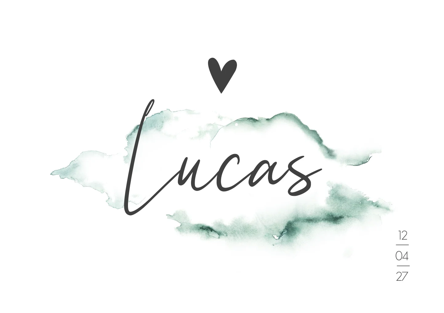 Een romantisch geboortekaartje met groene waterverf vlekken. Geboortekaartje Lucas is een romantisch kaartje met groene waterverf vlekken en goudfolie stipjes. Wil je liever een andere kleur voor de waterverf vlekken? Neem dan even een kijkje in onze editor voor alle opties!
