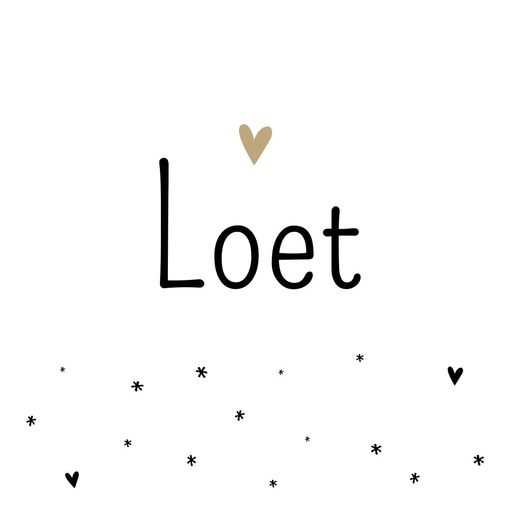 Wit geboortekaartje met zwarte hartjes en sterretjes. Geboortekaartje Loet is een eenvoudig geboortekaartje. Wil je dit kaartje in een andere kleur zien? Open dit kaartje dan in de editor en kies jouw favoriete kleur.