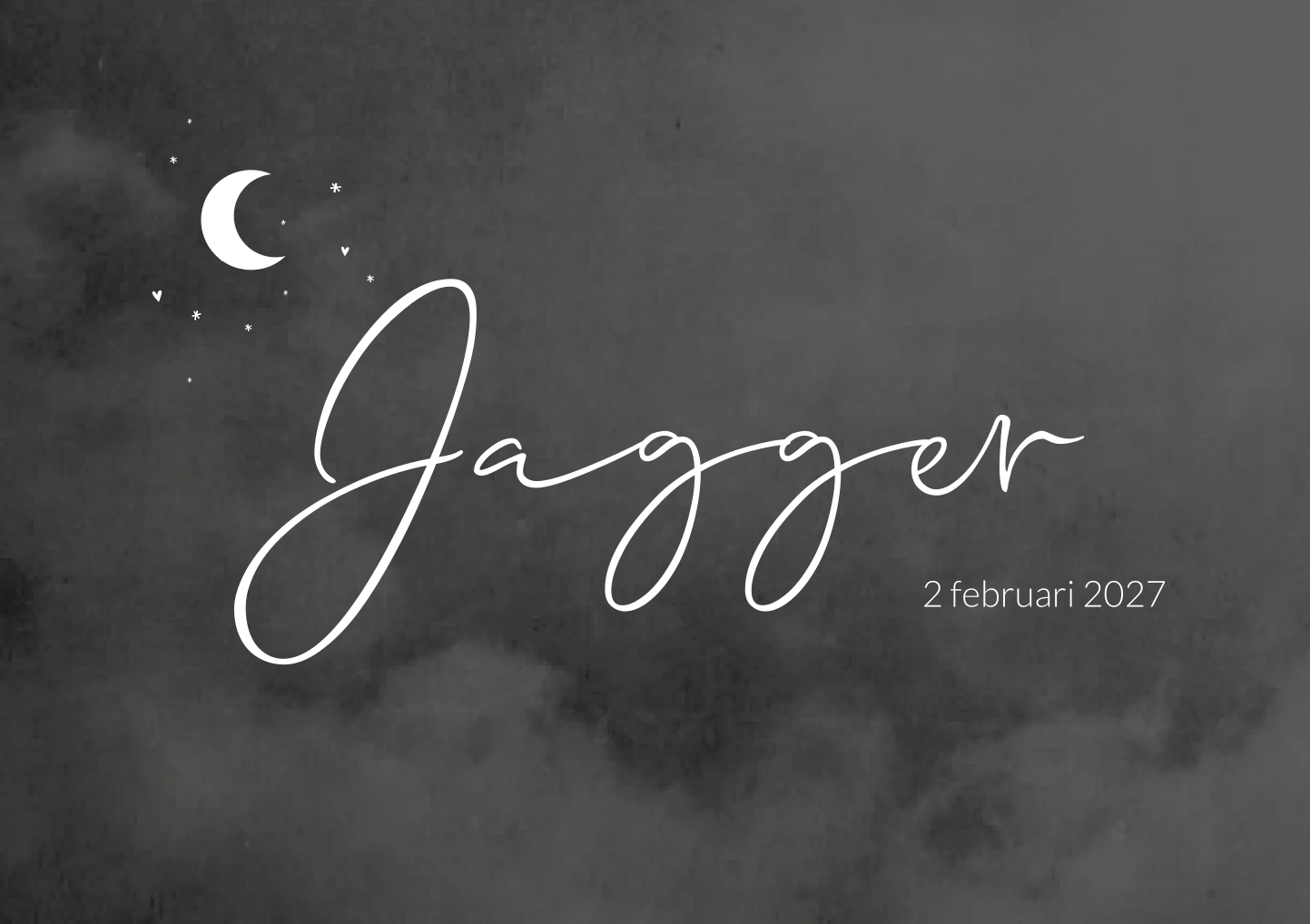 Stoere zwarte kaart Jagger met goudfolie naam, maantje en sterretjes. De achterzijde van de kaart bevat ook weer de goudfolie elementen en daarbij de tekst in het wit. Wil je dit ontwerp liever aanpassen naar je eigen wensen? Je maakt het in onze editor, veel plezier!
