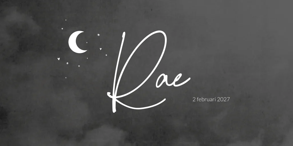Stoere zwarte kaart Rae Denz met goudfolie naam, maantje en sterretjes. De achterzijde van de kaart bevat ook weer de goudfolie elementen en daarbij de tekst in het wit. Wil je dit ontwerp liever aanpassen naar je eigen wensen? Je maakt het in onze editor, veel plezier!