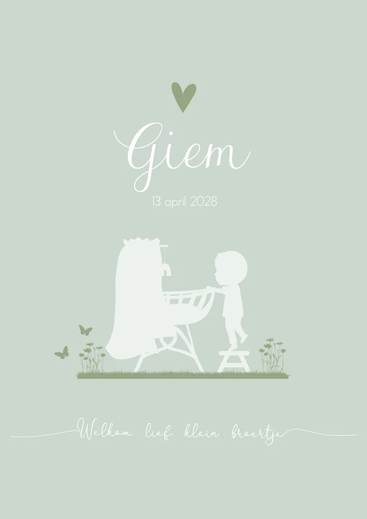 Een super schattig zacht groen babykaartje Giem, met een silhouet van een broertje die over het randje van de wieg kijkt naar zijn kleine broertje. Ze zijn omgeven door een prachtige tuin met bloemen en vlinder. Je past de kaart eenvoudig en snel aan in onze online editor.