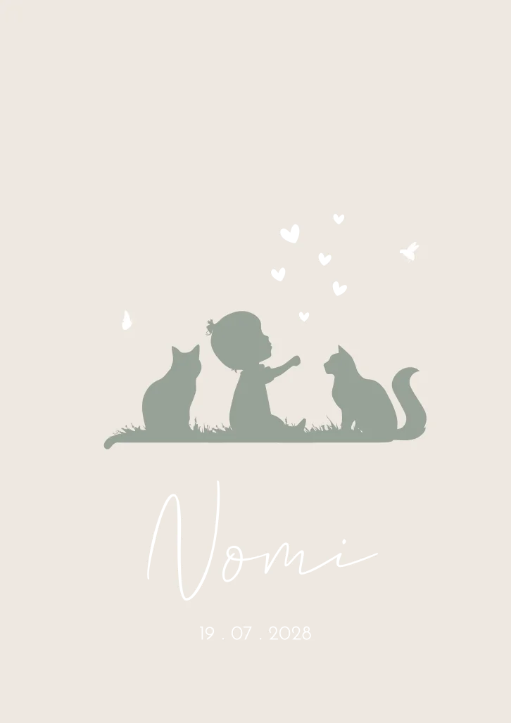 Een trendy enkele staande babykaart Nomi in een neutrale beige kleur. Op de geboortekaart zit een meisje op het gras, tussen twee katten in. De poesjes kijken naar het kleine kindje. Ze zijn omringt door hartjes in koperfolie en een bij en vlindertje. Je past het kaartje volledig zelf aan in de editor.