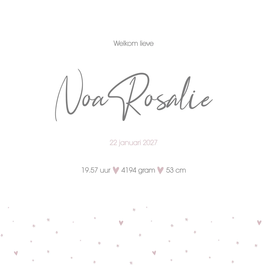 Een lief roze geboortekaartje met kleine hartjes en sterretjes. Verander de kleur en/of opmaak van geboortekaartje Noa eenvoudig in onze editor.