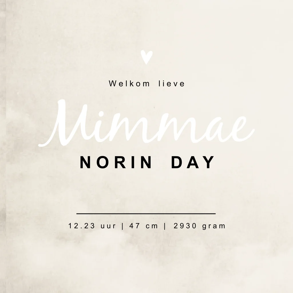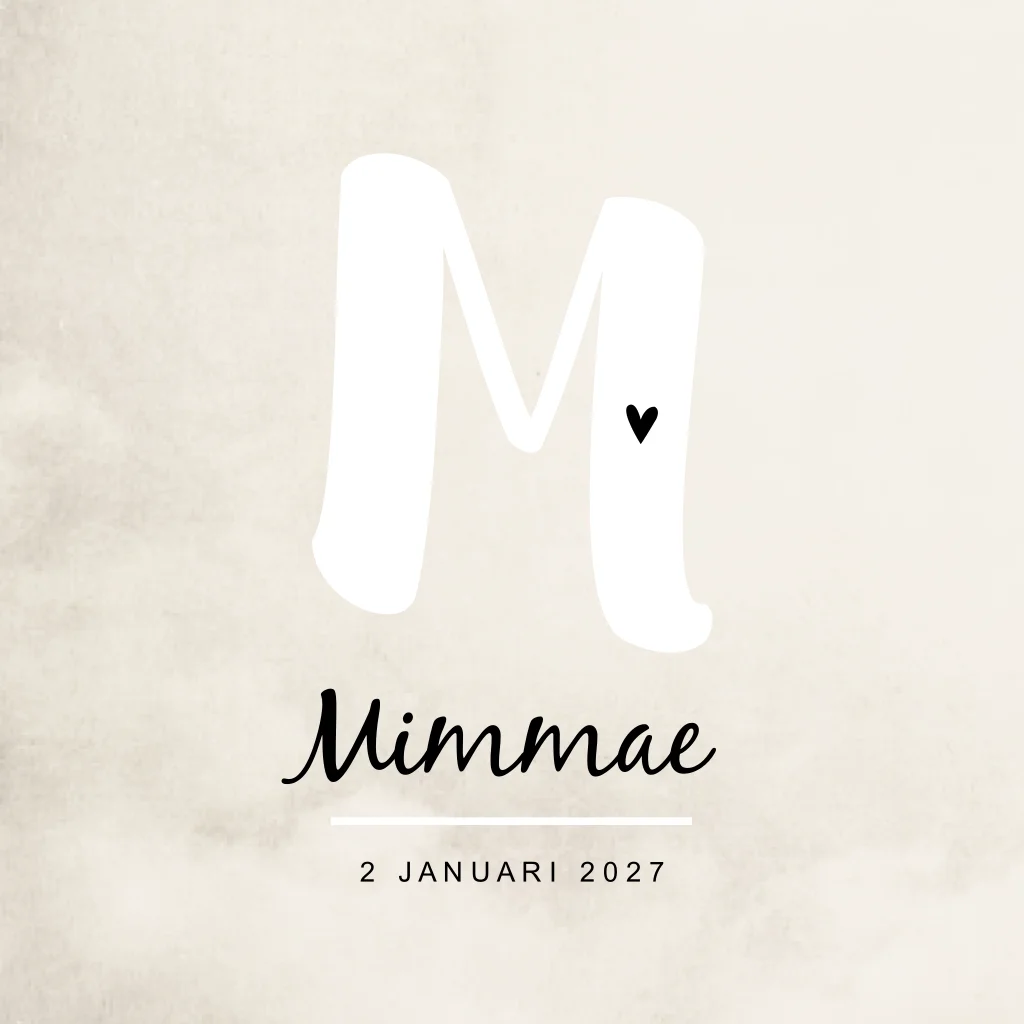 Stoer beige/crème geboorte kaartje met zwarte en witte tekst. De grote letter op de kaart Mimmae springt er uit voor een opvallende en toch neutrale look.