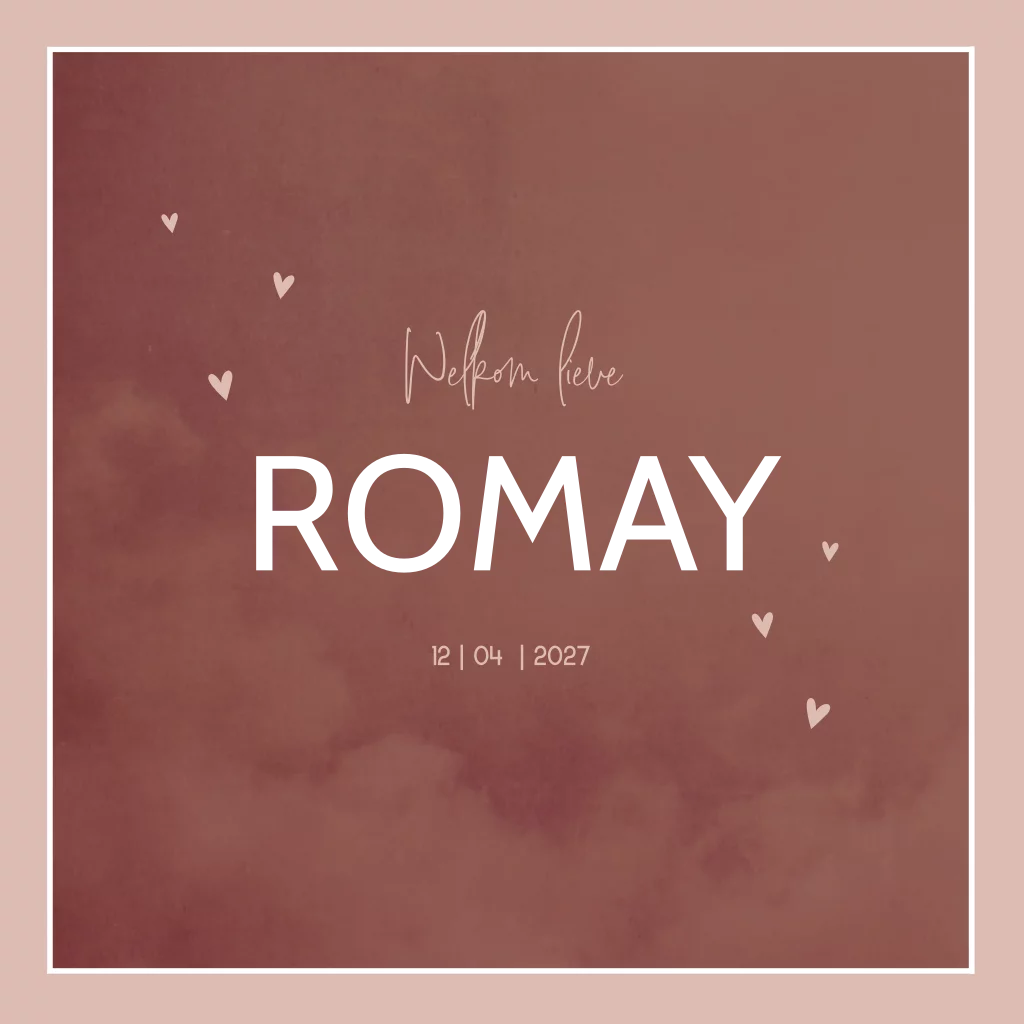 Een bruin/roze geboortekaartje met kleine lieve hartjes. De letters van geboortekaartje Romay springen er uit met de koperfolie.