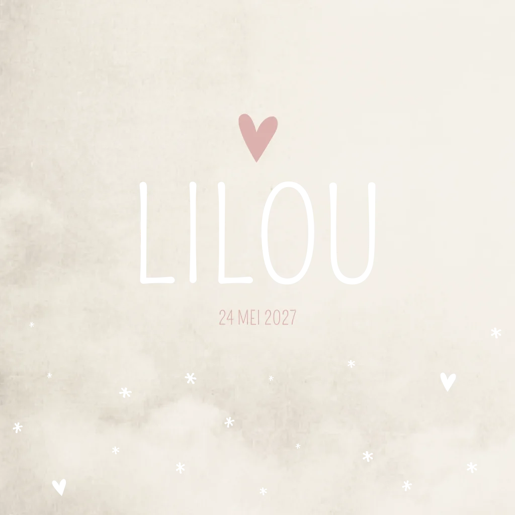 Beige gewolkt geboortekaartje met geïllustreerde hartjes en sterretjes. Geboortekaartje Lilou heeft koperkleurige details die ontzettend mooi uitkomen in koperfolie.