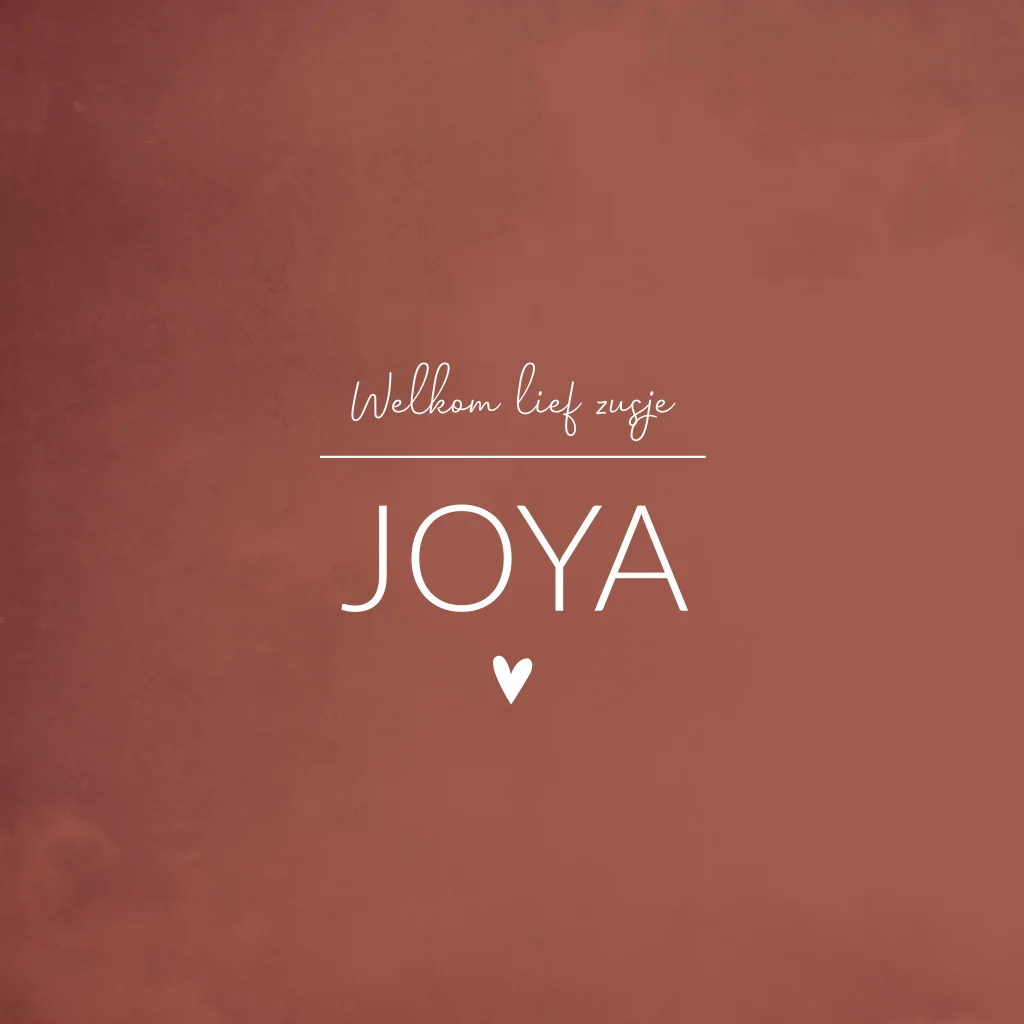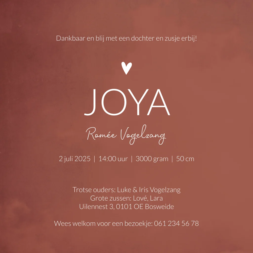 Roestkleurig geboortekaartje met een illustratie van een hartje en aan de binnenkant een broertje met twee zusjes. Laat geboortekaartje Joya bedrukken met koperfolie voor een extra mooi effect. Pas het kaartje naar eigen wens aan in de editor.
