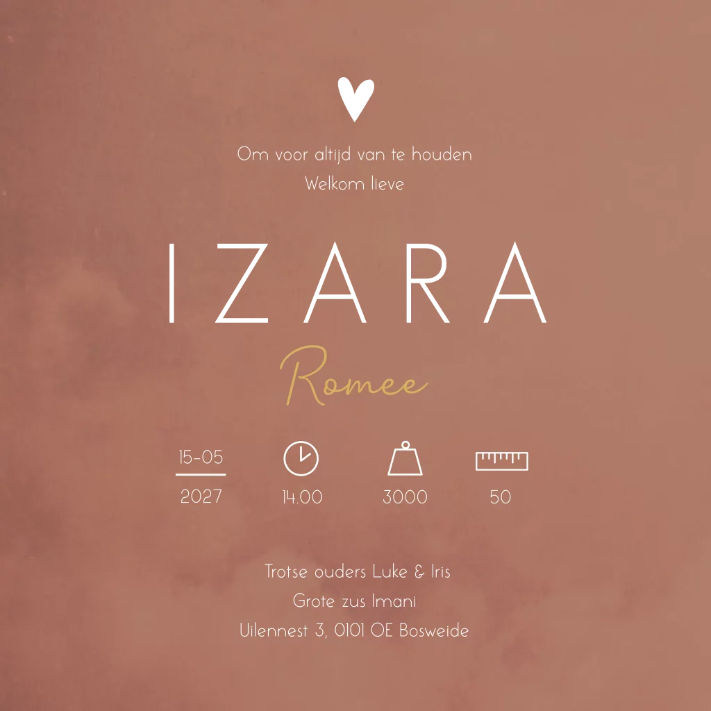 Hip en trendy oudroze geboortekaartje met gouden hartje en naam. Geboortekaartje Izara is ontzettend mooi wanneer je het bedrukt met goudfolie, in combinatie met de oudroze achtergrond springt de naam er uit.