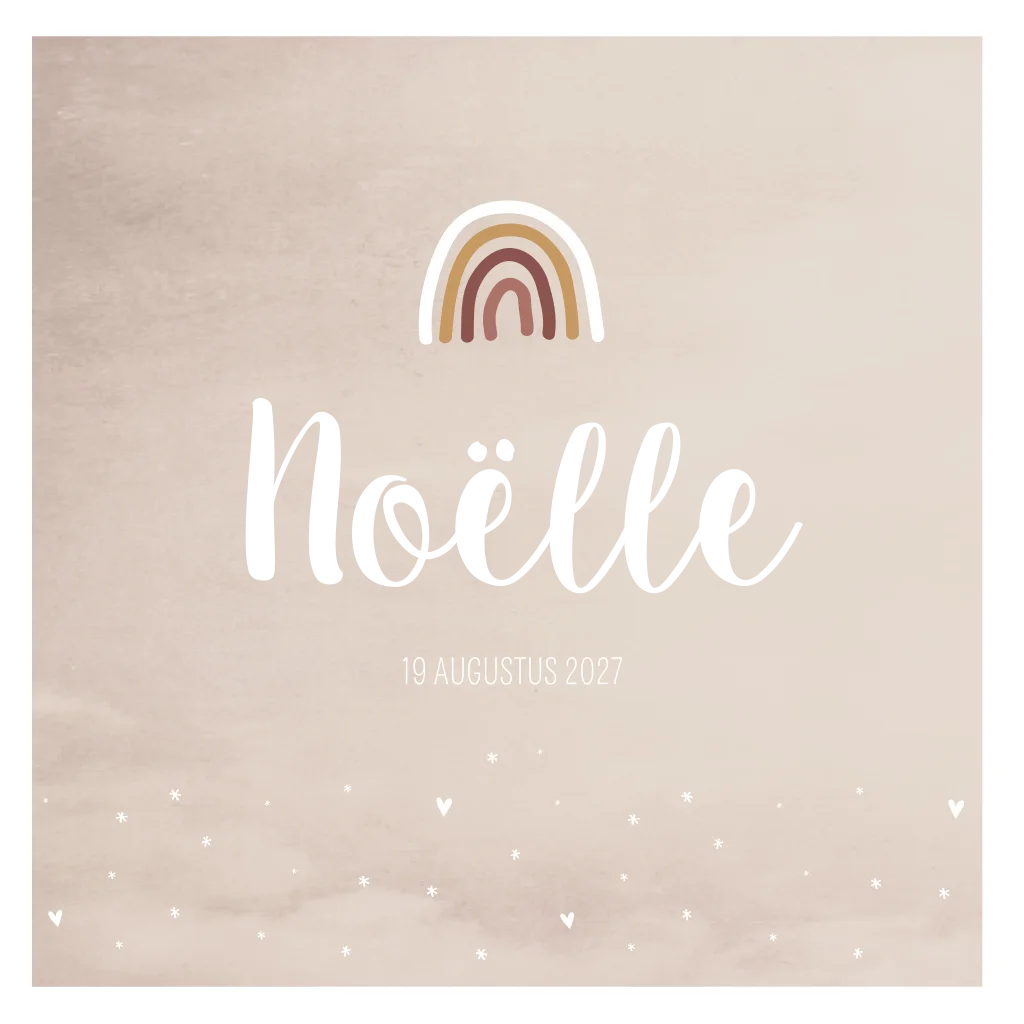 Geboorte kaartje in lichtroze kleur met een lief regenboogje. De subtiele hartjes en sterretjes op geboortekaartje Noëlle maken het kaartje helemaal af.