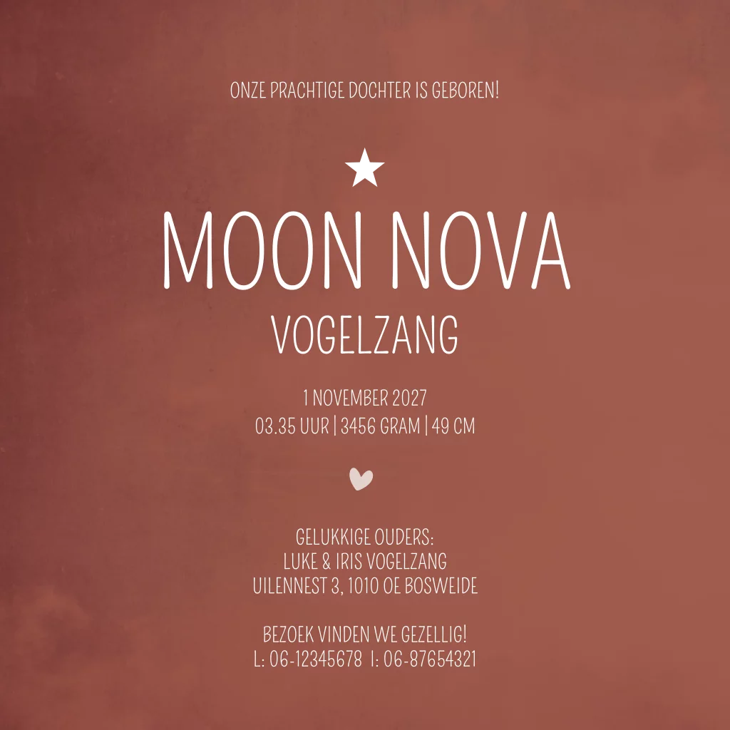 Roestbruin kaartje met heelal details. Geboortekaartje Moon heeft elementen met goudfolie waardoor hij heel mooi glimt!