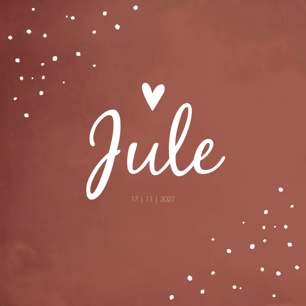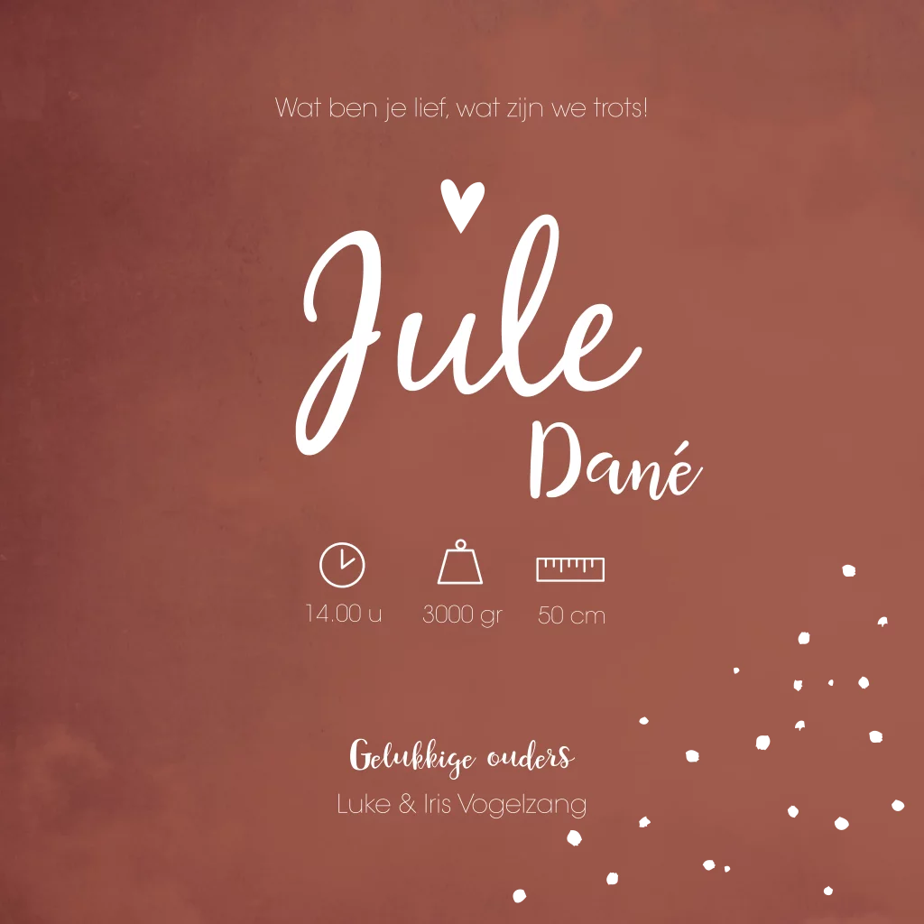 Roestbruin geboortekaartje met hartjes en stipjes in koperfolie. Geboortekaartje Jule heeft een stoere kleur, de details maken het kaartje wat speelser. Bekijk dit kaartje ook eens in andere kleuren in de editor!