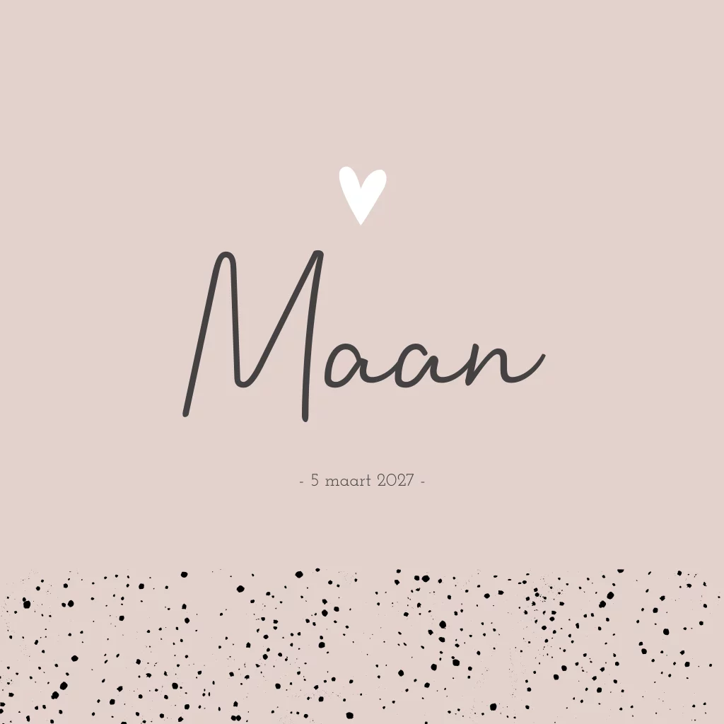 Zachtroze geboorte kaartje met zwarte stipjes en roze hartjes. Geboortekaartje Maan is ook mooi met koperfolie. Bekijk de verschillende opties in de editor!