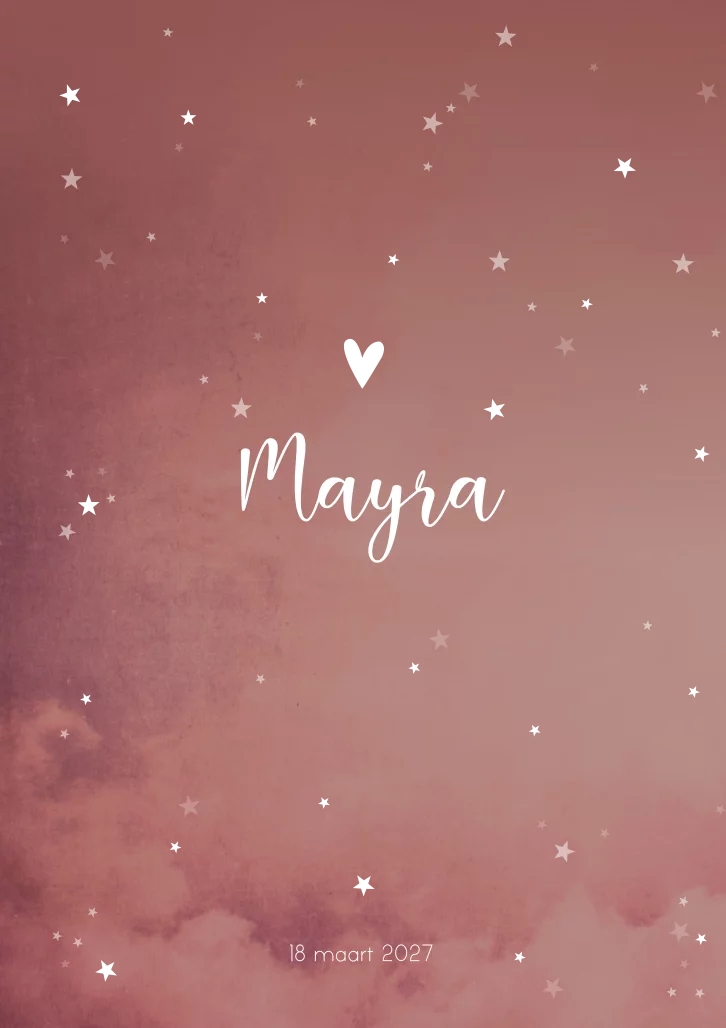 Een warm roze gewolkt romantisch geboortekaartje vol met kleine sterren in wit en goudfolie. Een speciaal kaartje voor een speciaal wondertje. Kaartje Mayra is prachtig wanneer je deze laat bedrukken met goudfolie. Zo glinsteren de sterren je tegemoet!