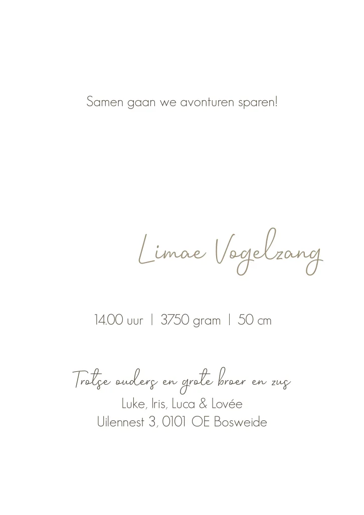 Stijlvol en neutraal geboorte kaartje voor een jongen of meisje. De naam is in koperfolie gezet, deze kun je gemakkelijk zelf aanpassen naar een andere kleur. De babyfoto kun je vervangen met je eigen foto of verwijderen. Je past kaartje Lorah volledig zelf aan in onze editor!