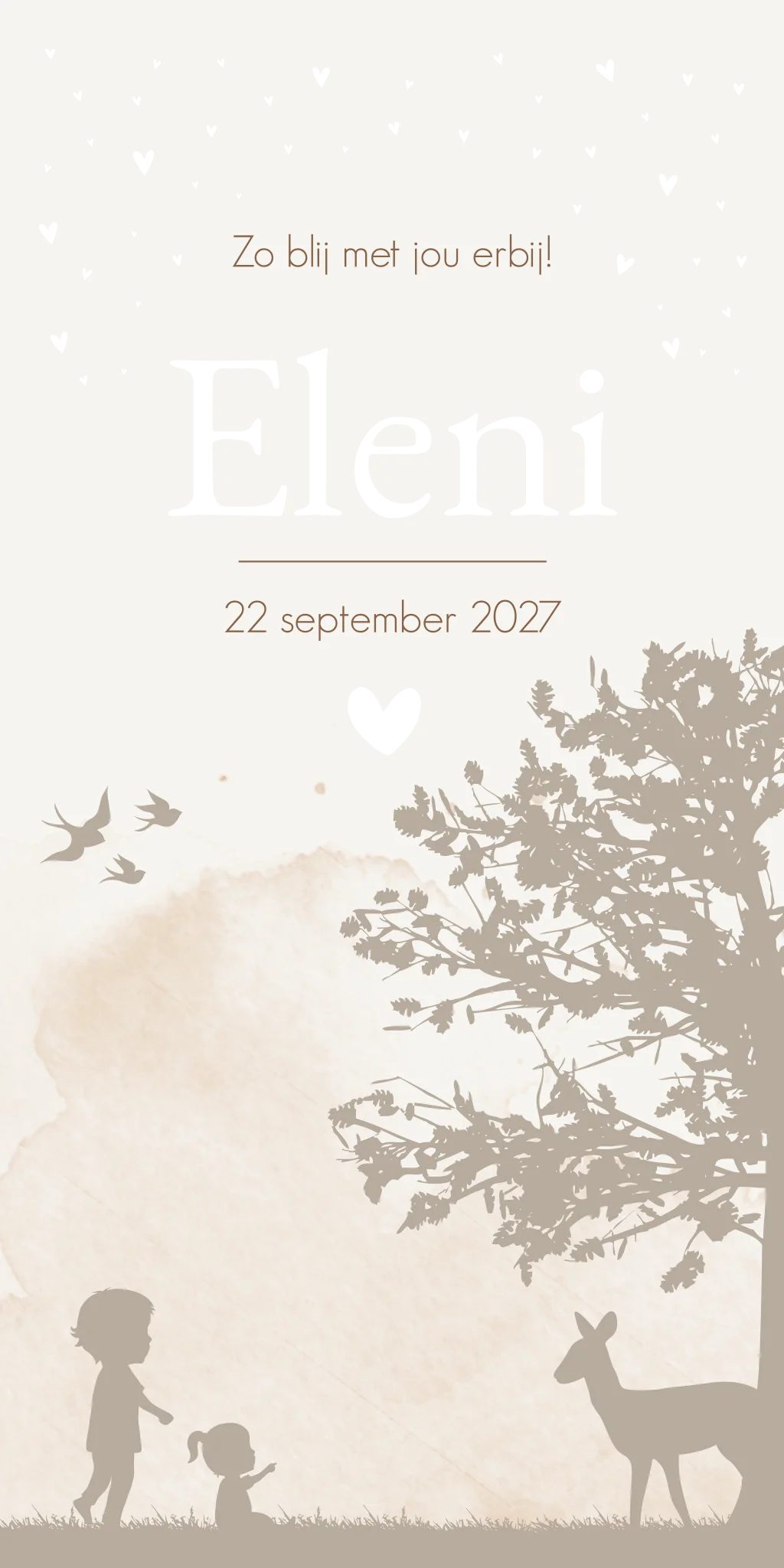 Een beige creme geboortekaartje Eleni met waterverf effect en een illustratie van twee kindjes, een boom en hertje. Je past de illustraties helemaal zelf aan in de editor.