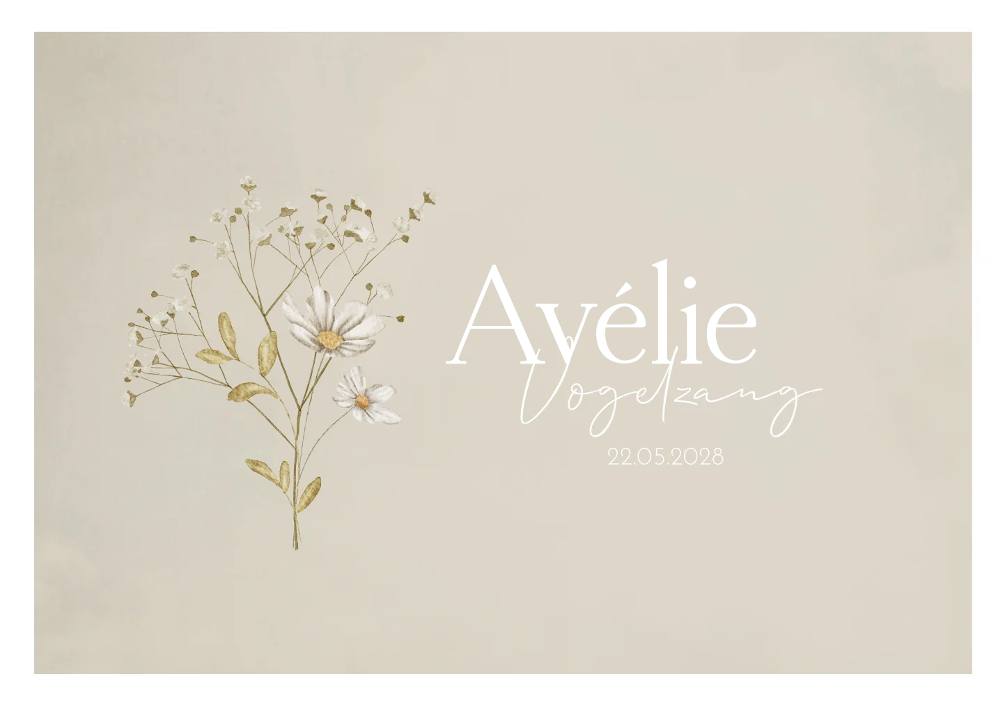 Stijlvol en romantisch geboortekaartje Avélie in beige kleuren met diverse bloemetjes in waterverf stijl. Je past de kleuren van de kaart eenvoudig aan, zo ook de typografie. Wil je een silhouet van een kindje erbij op, bekijk dan onze beeldbank voor veel illustraties van kinderen.