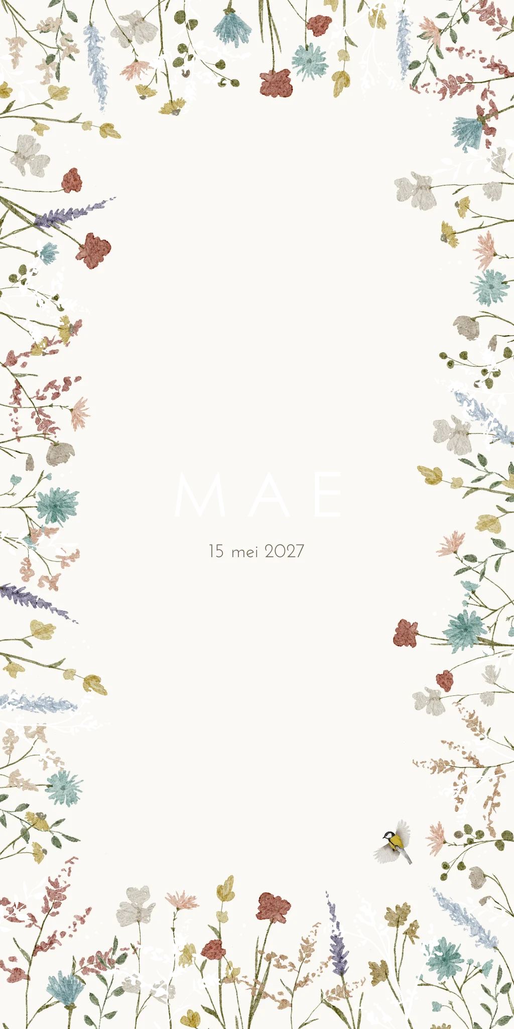 Een romantisch bloemenkaartje vol met kleurrijke bloemen in alle kleuren! Op kaartje Mae zijn een paar takjes en stipjes in goudfolie afgedrukt voor een speels effect. Zo is het kaartje chique, speels en kleurrijk. Wil je graag iets aanpassen? Neem dan een kijkje in onze editor voor de opties.