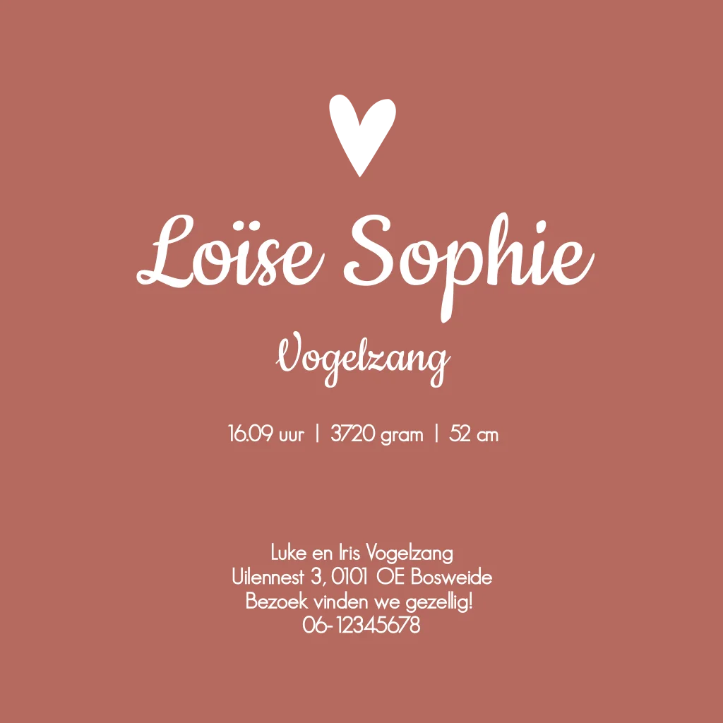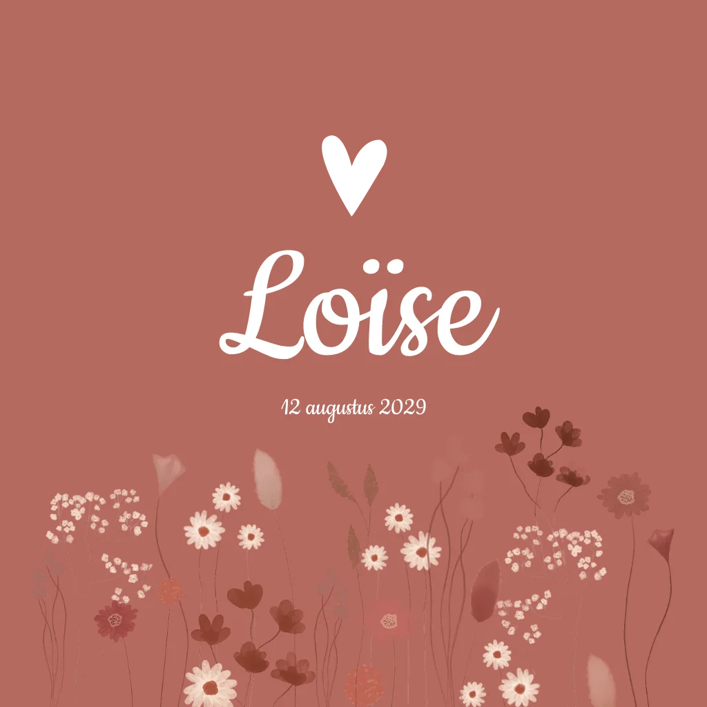 Een lief geboortekaartje met een getekend bloemenveld van droogbloemen. Kaartje Loïse is door de roze kleur extra schattig. De hartjes zijn in roséfolie gezet, dit kun je makkelijk zelf aanpassen als je het liever in goudfolie of koperfolie wilt. Of wanneer je niet van folie houdt kun je de folie omzetten naar een roze kleur. Kom je er niet uit? App of mail ons dan, we helpen je zsm!