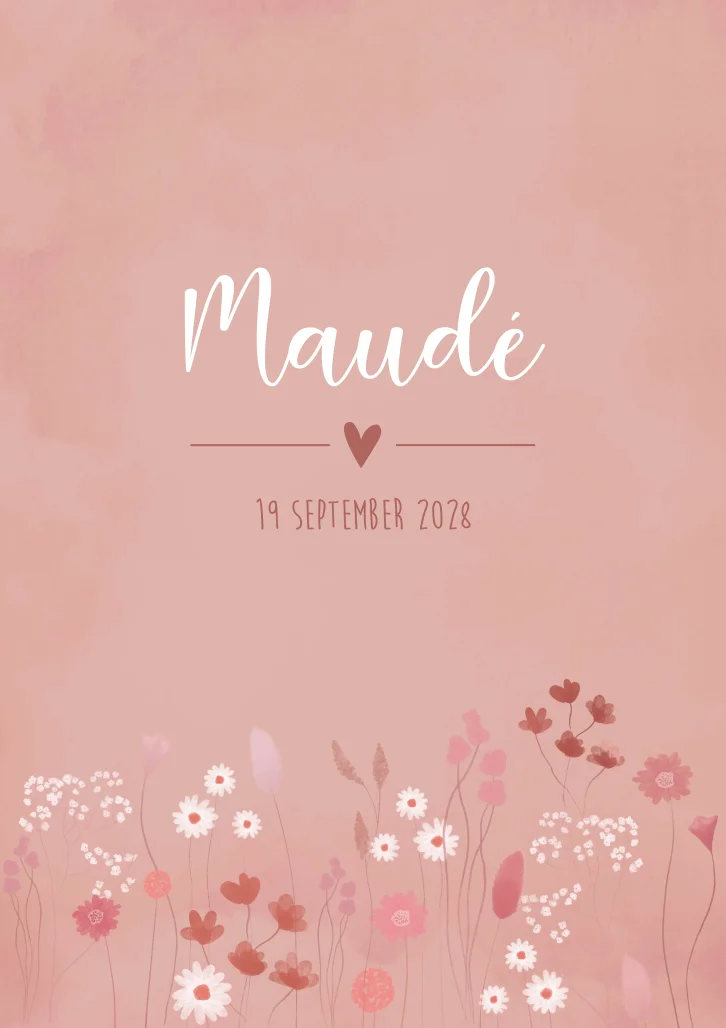 Een lief geboortekaartje met een getekend bloemenveld van droogbloemen. Kaartje Maudé is door de roze kleur extra schattig. Je kunt het volledig aanpassen qua kleur, opmaak en lettertype.