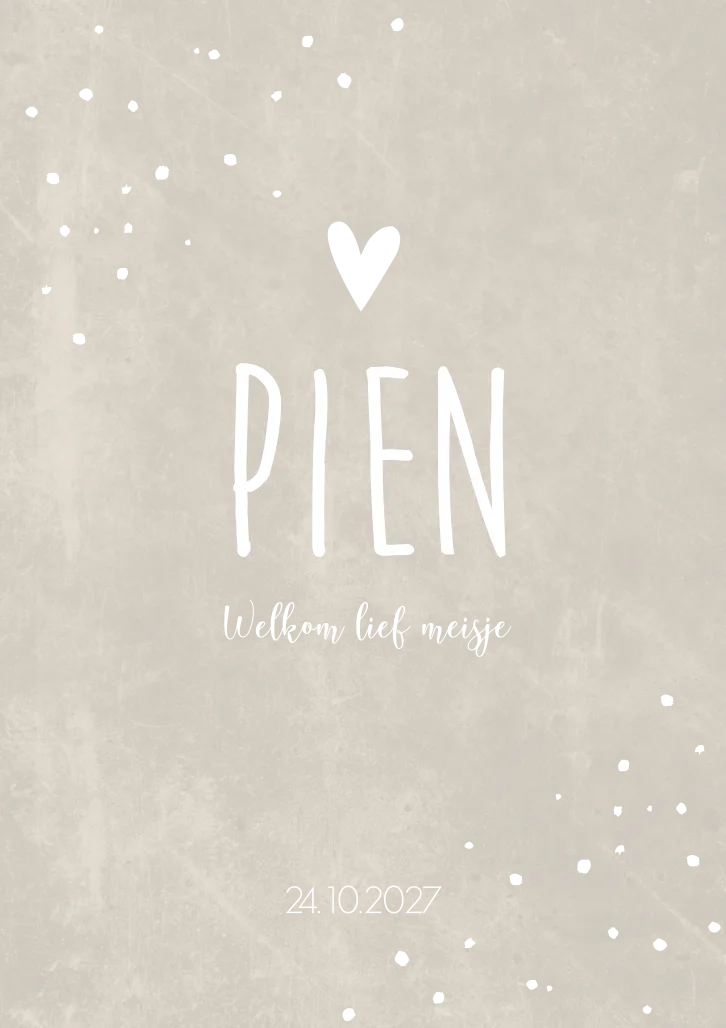 Een trendy en hip geboortekaartje in een beige/ crème kleur. De gouden stippen maken de kaart speels. Geboortekaartje Pien is erg mooi met goudfolie. Bekijk de verschillende opties in de editor.