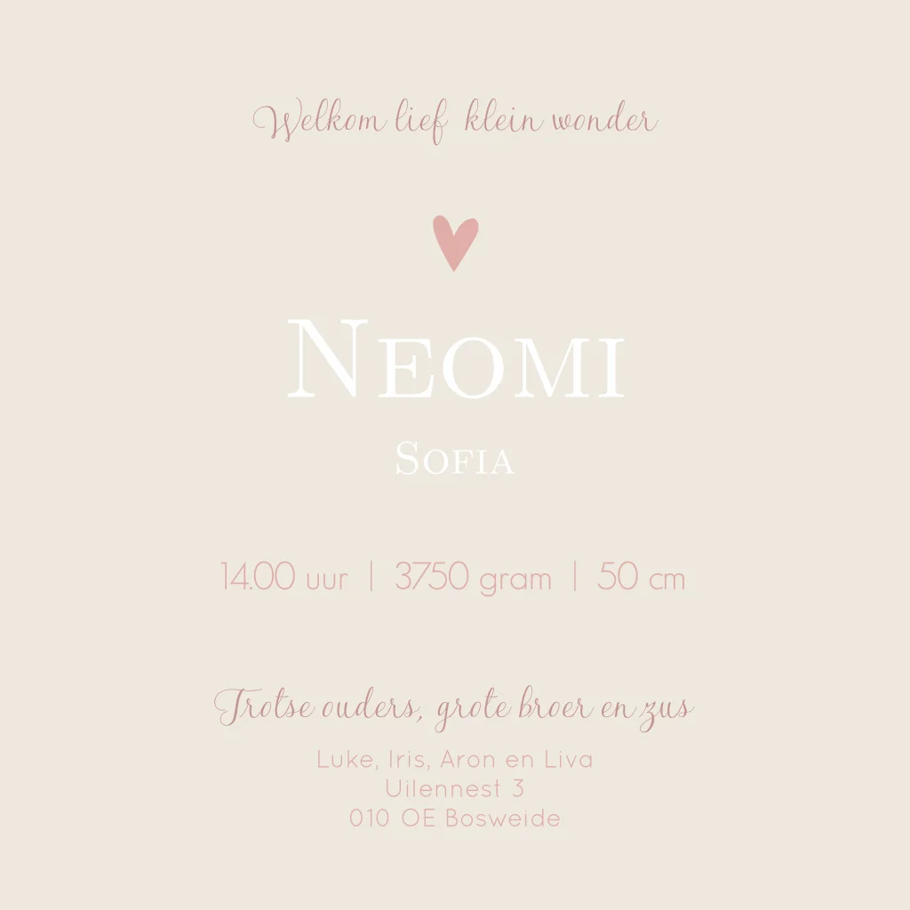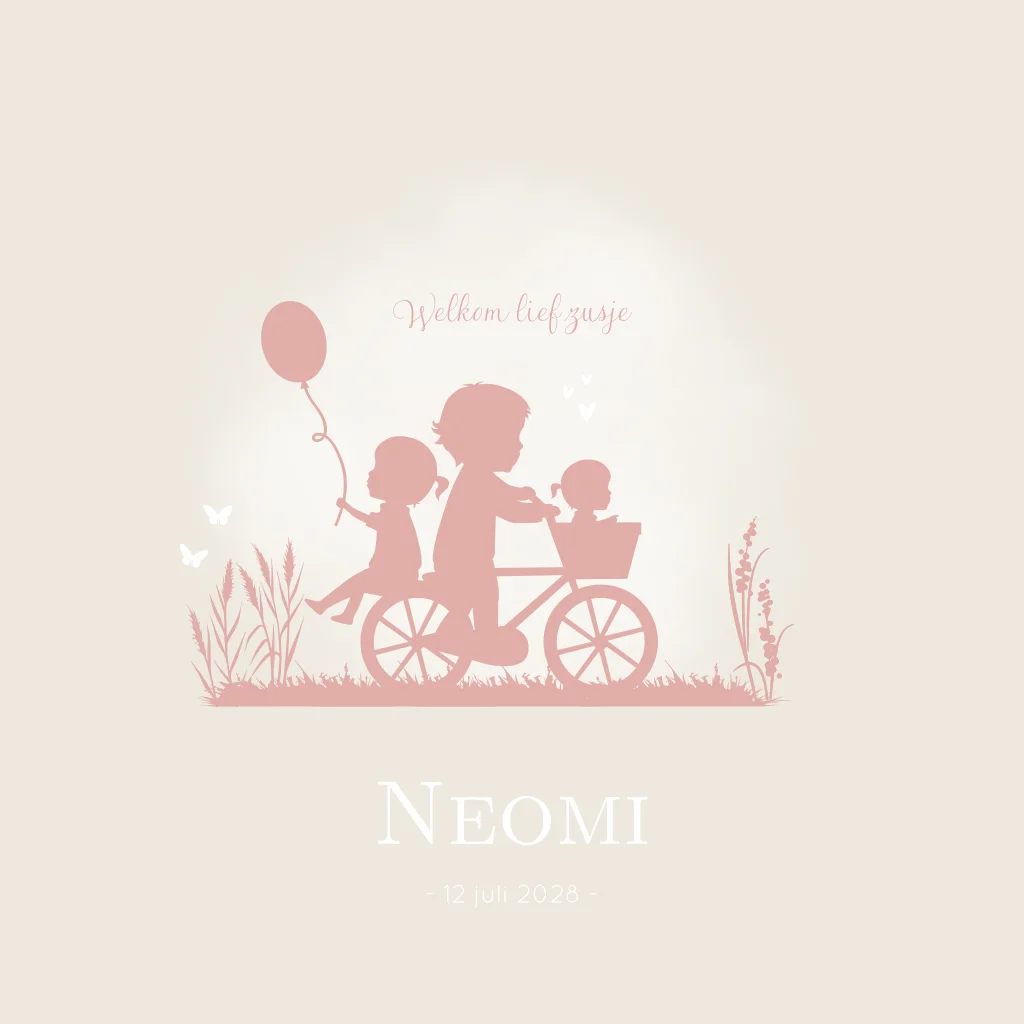 Een beige met zachtroze geboortekaartje Neomi met een silhouet illustratie van een broer en zus die samen op een fiets aan het fietsen zijn en grote zus heeft een ballon in haar handje. Ze fietsen samen in de natuur. Er fladderen 2 vlinders en de liefde spat er vanaf in de vorm van hartjes. Je past de illustraties, opmaak en kleuren helemaal zelf aan in onze online editor!