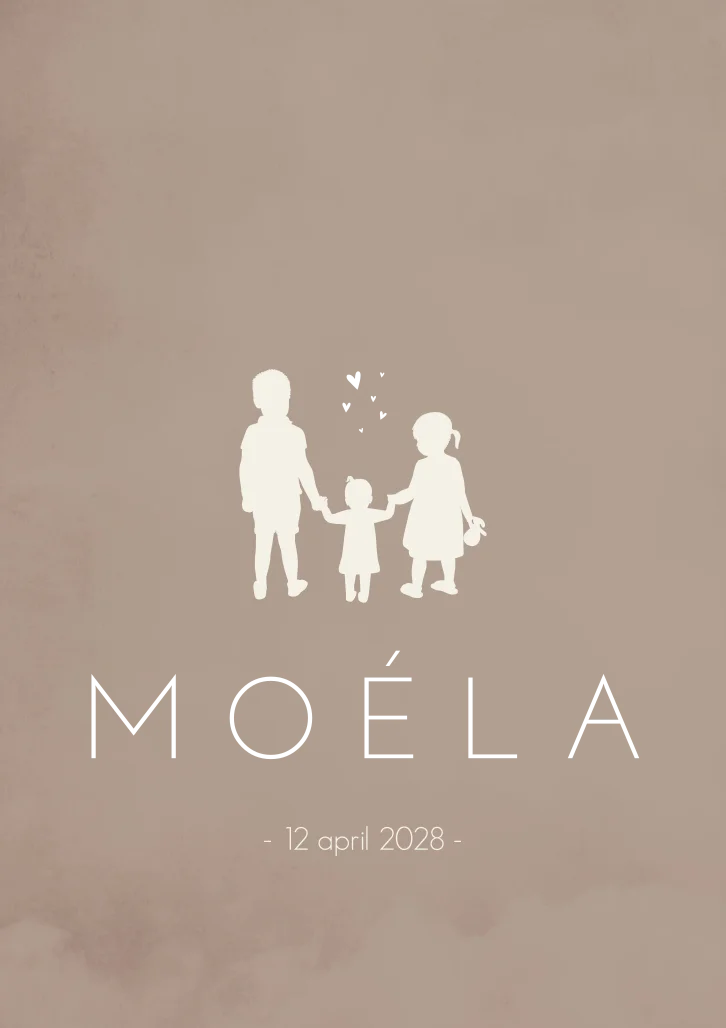 Stijlvol en warm bruin gewolkt geboorte kaartje voor een jongen of meisje. De naam is in roséfolie gezet, deze kun je gemakkelijk zelf aanpassen naar een andere kleur. De babyfoto kun je vervangen met je eigen foto of verwijderen. Je past kaartje Moéla volledig zelf aan in onze editor!