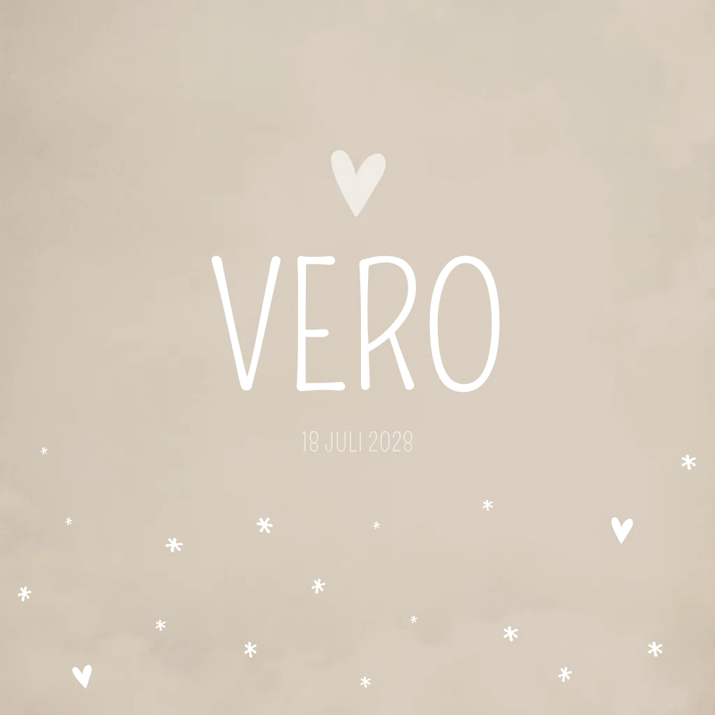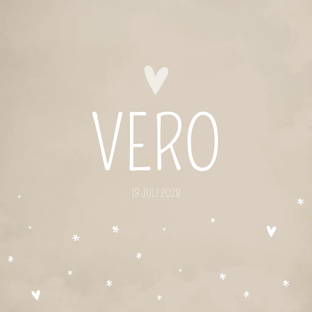 Crème/ beige gewolkt geboortekaartje met hartjes en sterretjes in roséfolie. Het kaartje Vero is naar wens aan te passen in de editor.