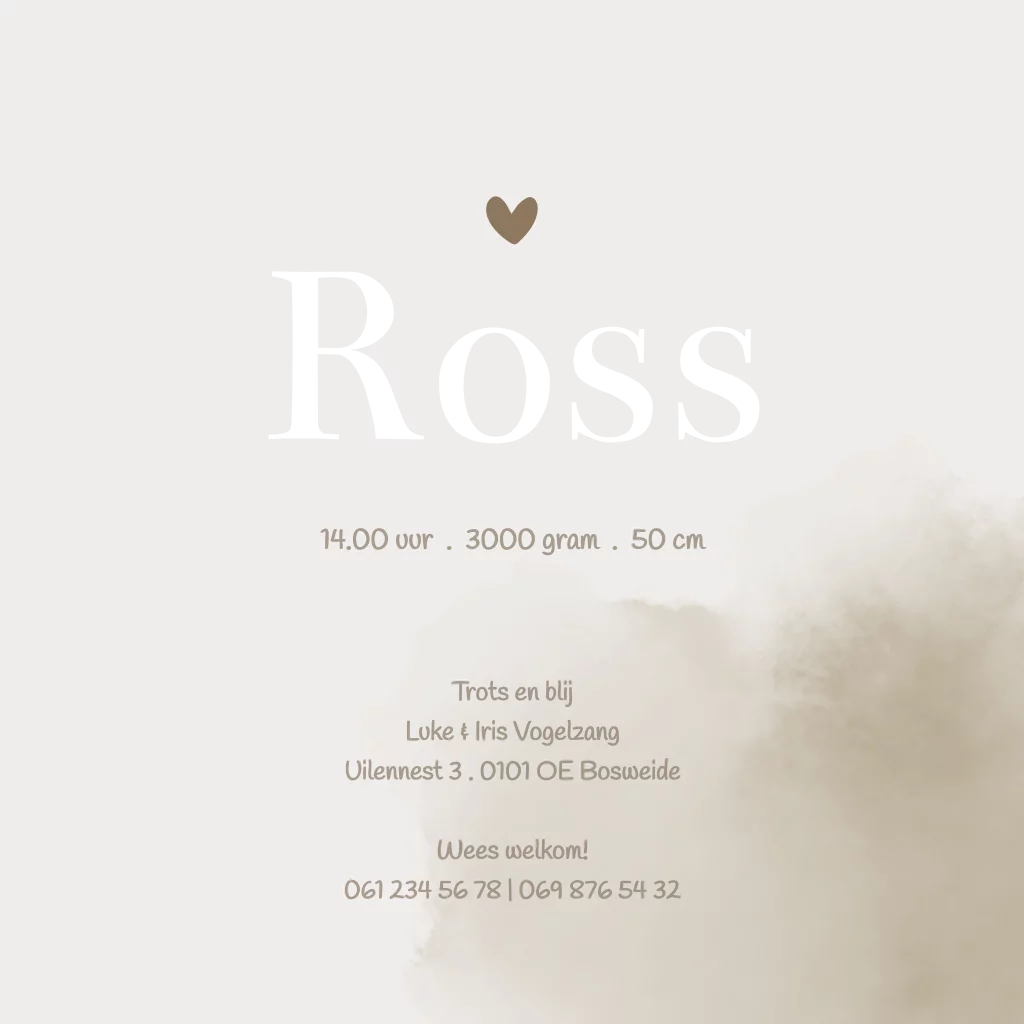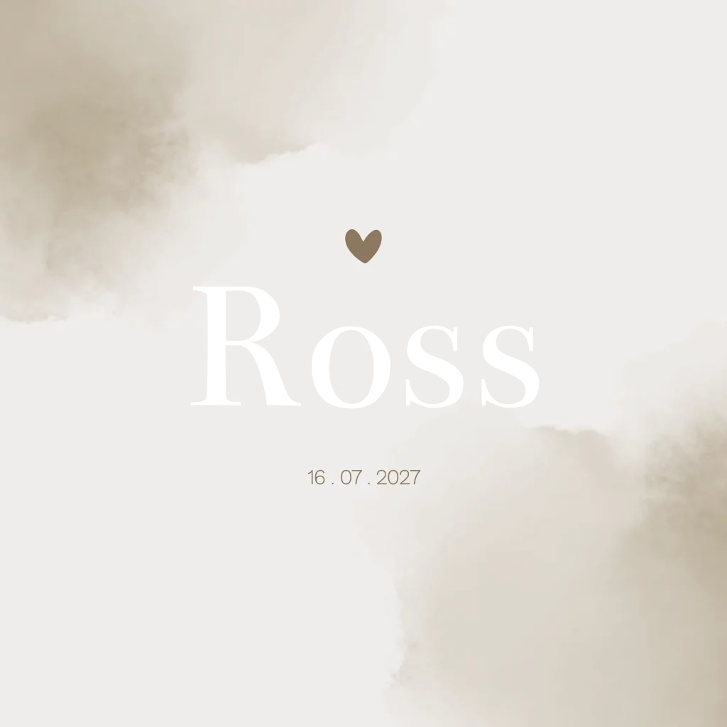 Warm, stijlvol, tijdloos en dromerig geboorte kaartje Ross met beige/ crème achtergrond en beige/ taupe/ bruine wolkjes in watercolor effect. Perfect voor de herfst. De naam springt er uit met goudfolie. Je kunt de kaart volledig zelf aanpassen in onze online editor.