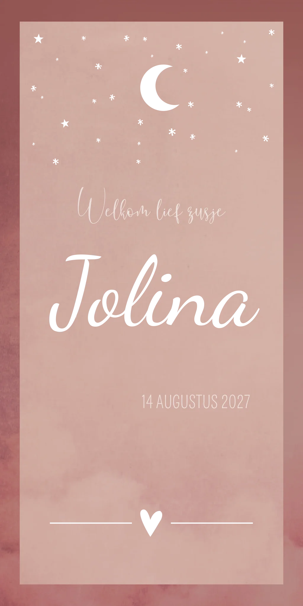 Een dubbel rechthoekig geboortekaartje in gewolkte roze kleur met een donkerroze omlijsting, hartjes in koperfolie en witte teksten.