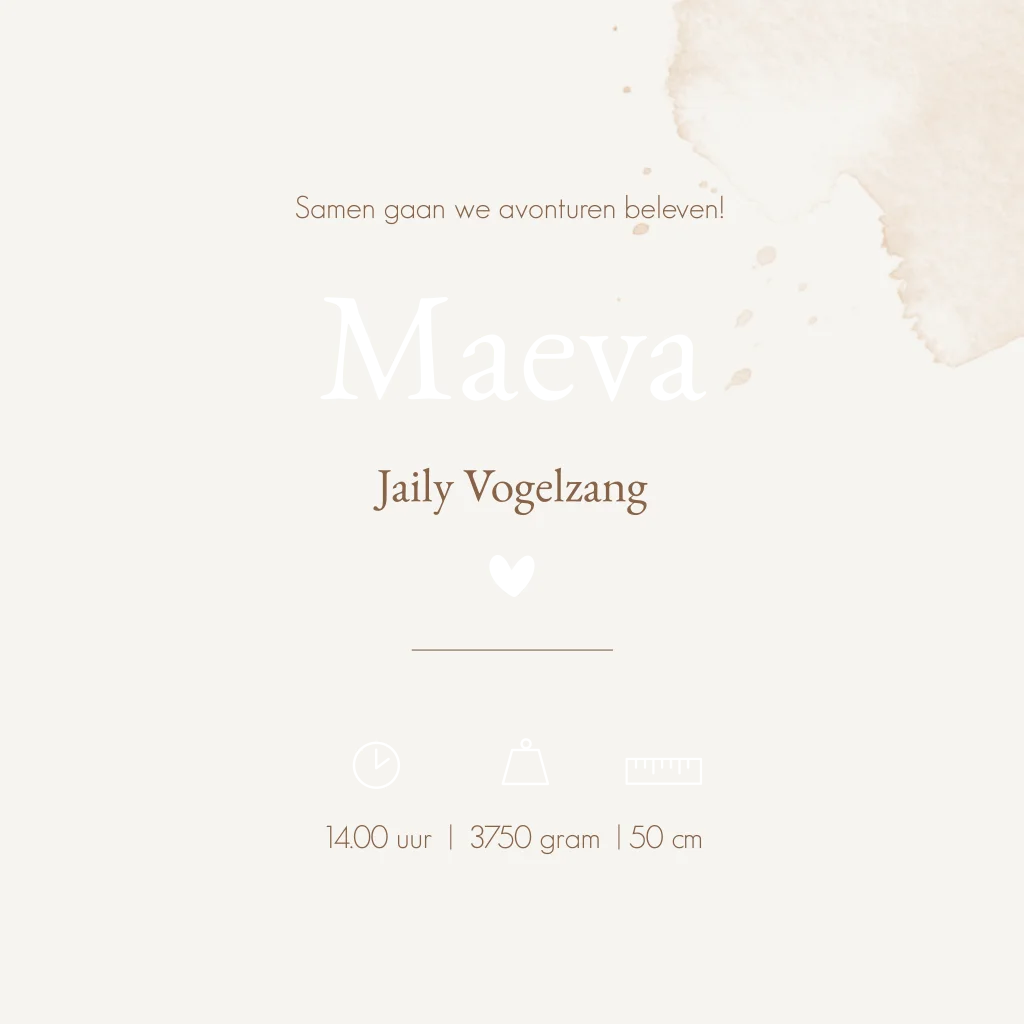 Een beige creme geboortekaartje Maeva met waterverf effect en een illustratie van twee kindjes, 2 zusjes, een boom en hertje. Je kunt de illustraties van kindjes en dieren helemaal zelf aanpassen naar jouw gezinssituatie of huisdieren. Je vindt het allemaal in onze beeldbank in onze online editor. Heb je onze hulp erbij nodig? App of mail gerust!