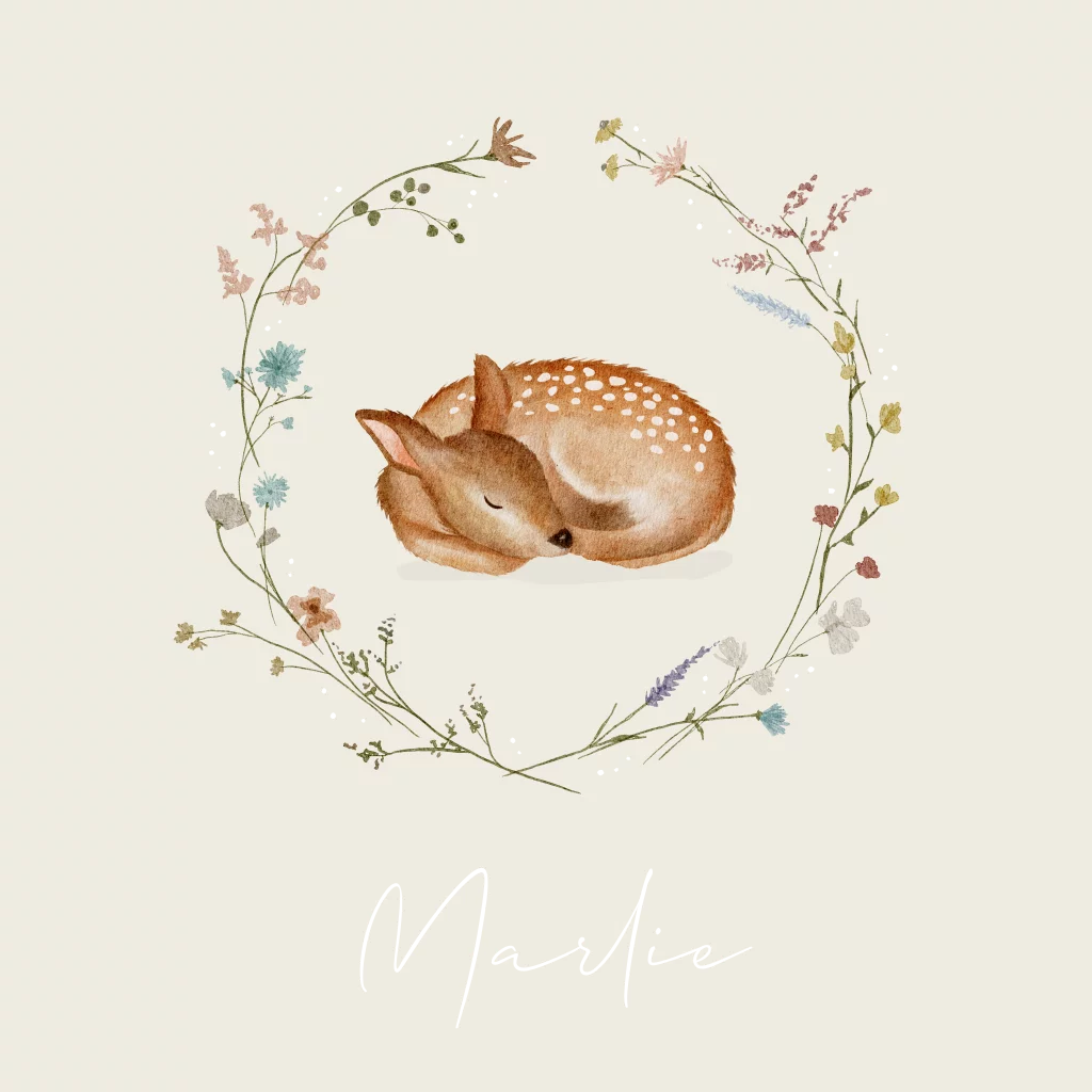 Een romantisch geboortekaartje met een illustratie van een slapend hertje in waterverf stijl. Het hertje wordt omringd door een krans met verschillende bloemetjes. Door de krans heen zitten een paar kleine koperfolie stipjes. Kaartje Marlie is erg geschikt voor een lente of herfst kaartje. Wil je graag iets aanpassen? Neem dan een kijkje in onze editor voor de opties.