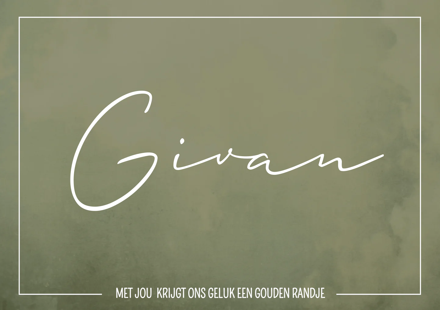 Stijlvolle groen gewolkte kaart in aquarel stijl met een gouden randje om de kaart en de toepasselijke tekst: Met jou krijgt ons geluk een gouden randje. Kaart Givan is makkelijk aanpasbaar in onze editor, zodat het geheel past bij de stijl van jouw babykamer.