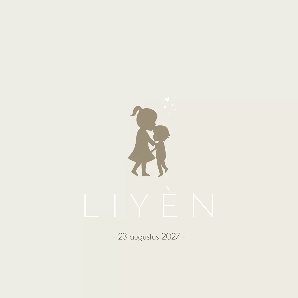 Super strak beige/ crème geboortekaartje Liyèn met een silhouet tekening van een zus die haar kleine broertje een kusje geeft. Omdat ze zoveel van haar kleine broertje houdt vliegen de vonken in hartjes vorm er vanaf!