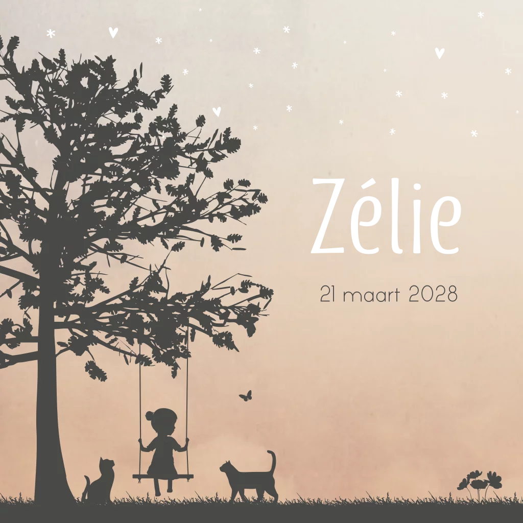 Een super leuk illustratief peach roze geboortekaartje met een grote boom met een schommel, waar een meisje aan het schommelen is. Een kat een een poes kijken naar het meisje en een vlindertje dwarrelt rond in de tuin. Kaart Zélie kun je volledig zelf aanpassen in onze online editor.